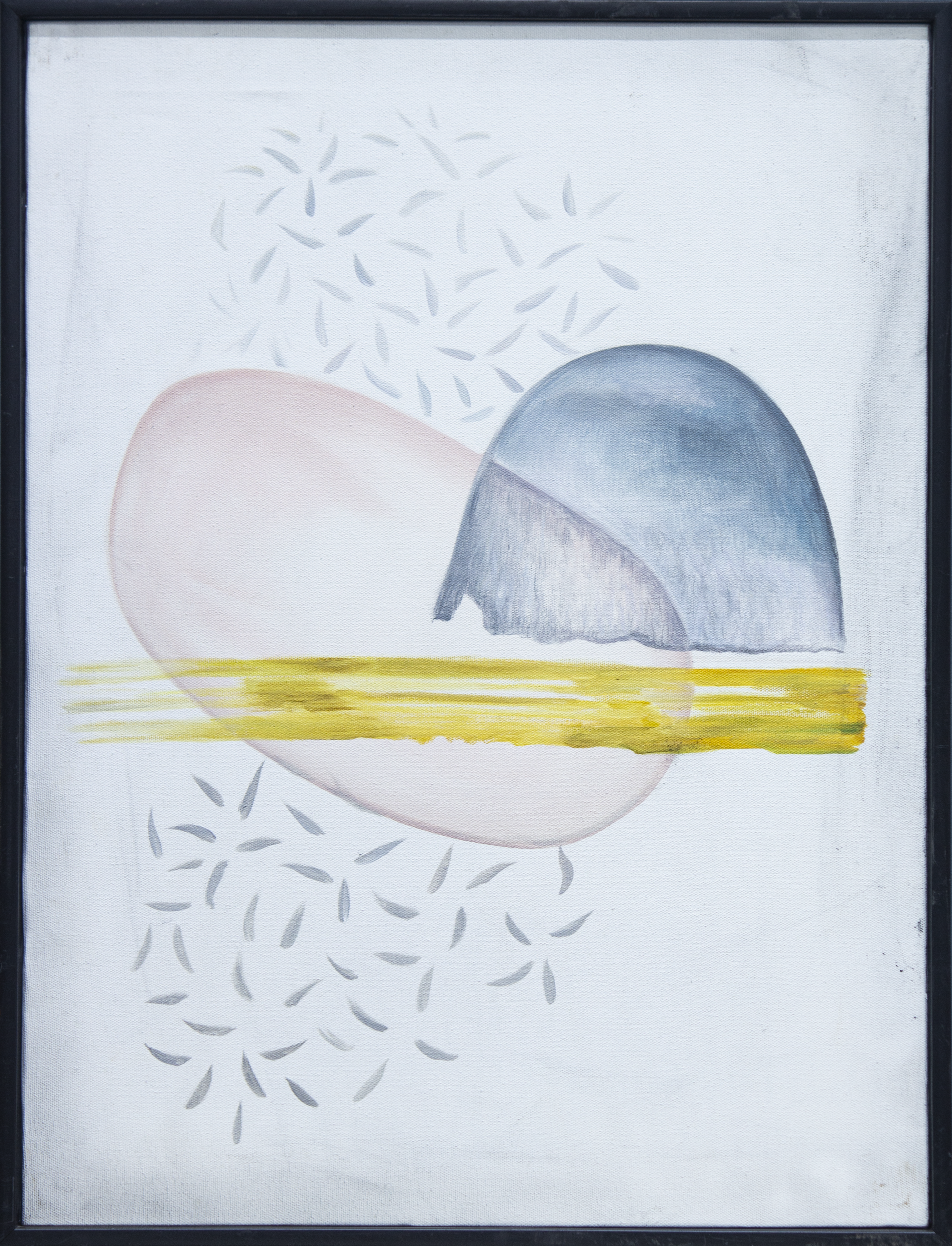 This artwork features a soothing blend of pastel shapes and gentle textures, creating a serene abstract composition. The overlapping forms and subtle color transitions evoke a sense of balance and tranquility, while the scattered leaf-like patterns add a hint of natural elegance. Perfect for modern interiors, this piece brings a calming and sophisticated ambiance to any space.