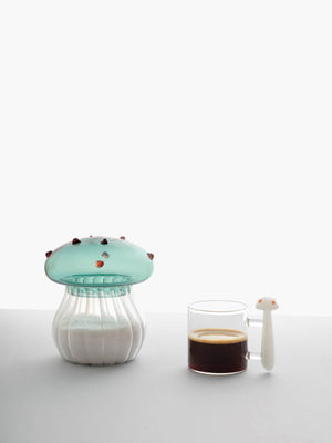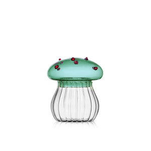 This ALICE Sugar Bowl Green Mushroom with Red Dots combo is whimsy with a stylish design in its perfect glass construction. It has a green mushroom cap painted in red dots, which lifts on the bottom to reveal a ribbed clear base. More than an ideal storage place for sugar or small goodies, it is an adorable piece that adds enchantment and character to your tabletop.