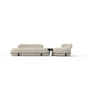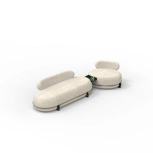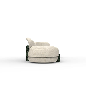 The sculptural bench is broad yet fine in detail; it balances tactile comfort with earthbound materiality. Specifically designed for modern living rooms, like gallery-like entryways or quieter transitional spaces, it presents as both a seating object and a bold visual gesture. With an extended frame and distinctive stone base, the bench beckons one to linger, a piece for spaces that appreciate design as an experience.