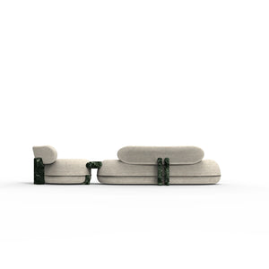 The sculptural framework sets the bench apart: Green Verde stone with a natural leather finish. The stone legs introduce an unforeseen material contrast to visually and physically ground the bench. The rich green coloring and subtle marbling of the Verde add a depth that marries earthiness with elegance to the fabric. In contrast, the leather finish enhances the stone texture without overtaking it, allowing natural variation to emerge in a soft matte expression.