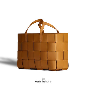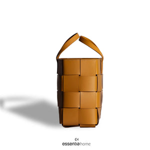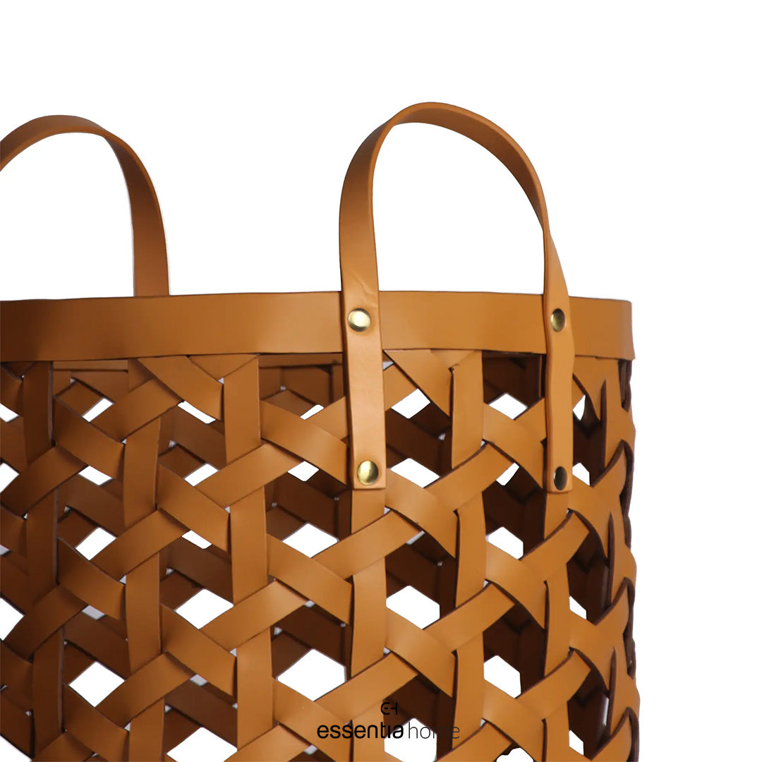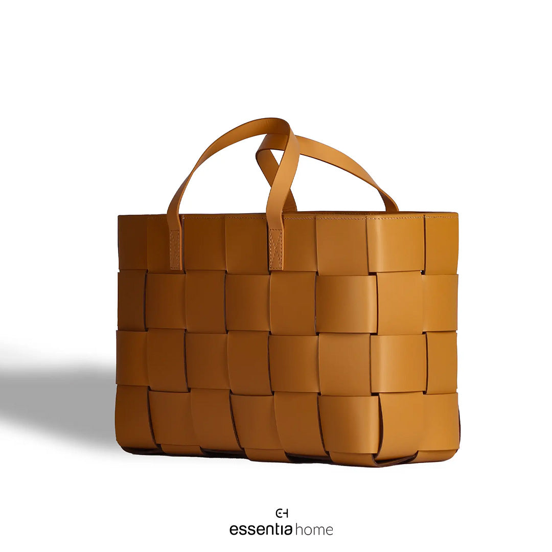 The distinctive crisscross pattern creates a silhouette that can easily be described as fluid but still bold. It is a basket that stands apart yet pairs perfectly with the very special interiors created by Essentia Interiors Delhi NCR. Two handles with brass hardware add to its usability and aesthetics, crossing even storage to become a refined must-have accessory for the home.