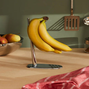 Designed by John Truex for Alessi, the JT01 Dear Charlie banana holder is an iconic piece of functional decor. Crafted from chrome-plated zamak, its sculptural silhouette resembles a playful tree branch, bringing a humorous yet refined presence to the kitchen. The weighted base and upward arm provide perfect suspension for bananas, preventing bruising while enhancing countertop organization.