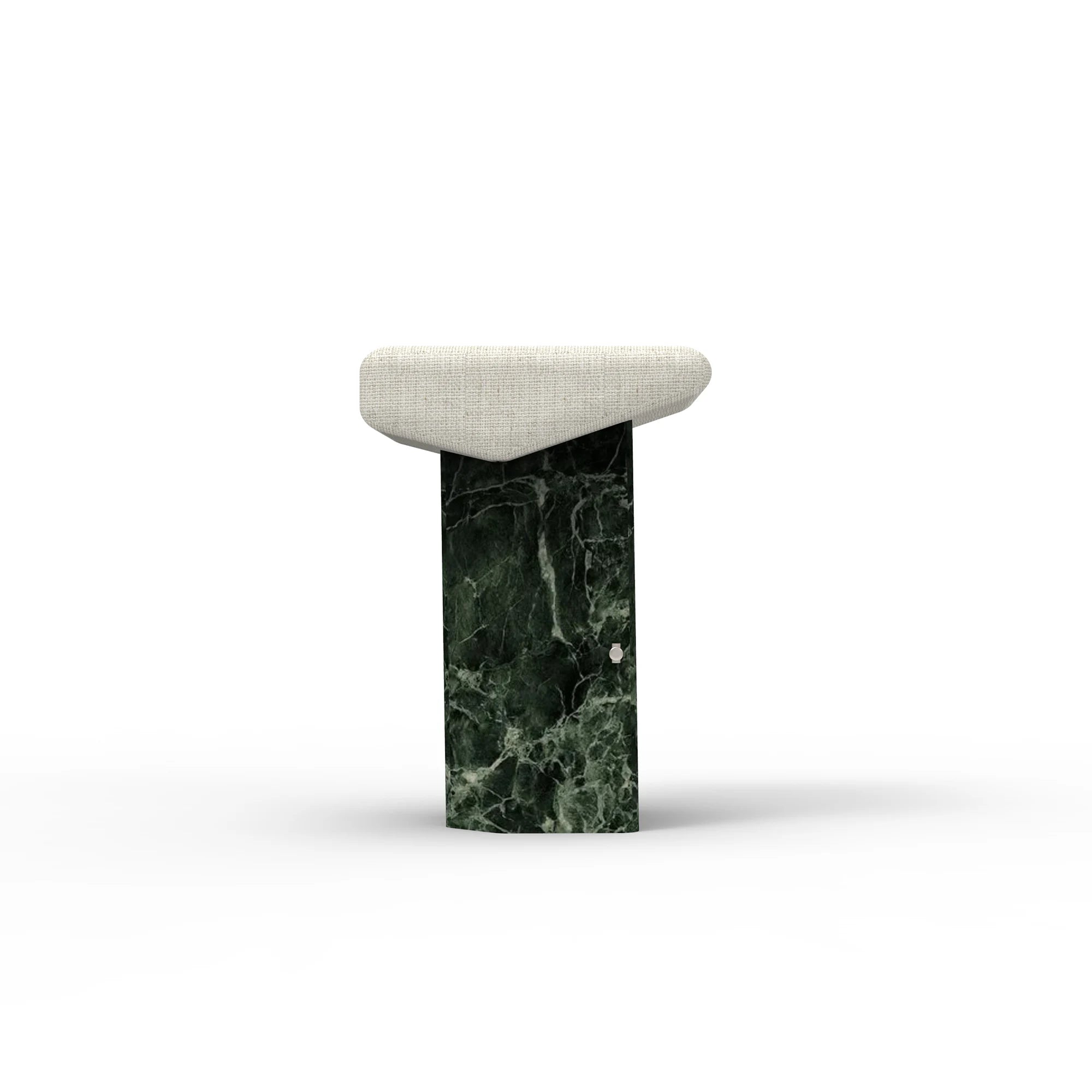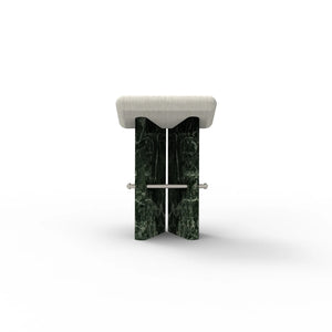 A seamless fusion of bold design and elevated comfort, the Bar Stool with Back offers a structured yet inviting seating experience. Its upholstered seat, crafted in Spora #100 fabric (a blend of linen and viscose), provides a plush touch, while the sculptural Verde Alpi marble legs lend a grounding presence. The integrated footrest in metal ensures ergonomic support, making this piece both visually striking and highly functional.