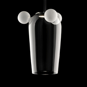 Materials: Hand-blown transparent Glass, Frosted Glass Spheres, Dark Grey Varnished Metal