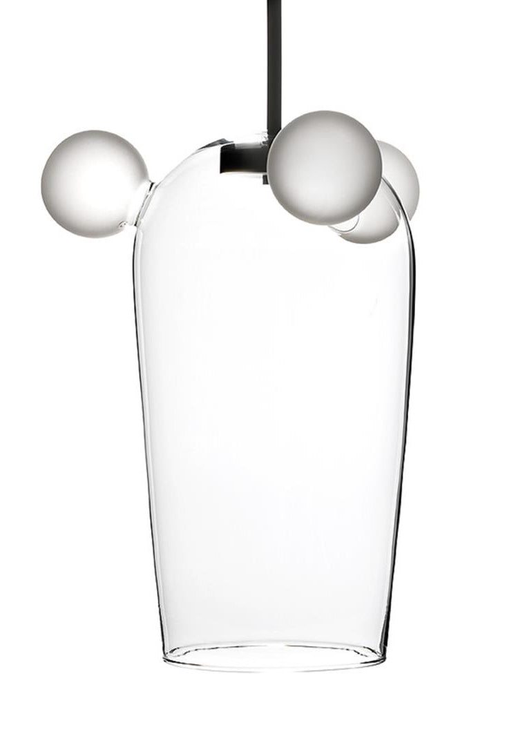 Feel the excellence of the Bartolomeo Suspension Lamp by Melogranoblu, which is a perfect blend of a stylish and functional item. This incredible pendant consists of a hand-blown transparent glass bell, which is harmonized with fragile frosted glass globes, thereby creating the effect of captivation. The hanging light has a sophisticated design that radiates class and elegance to any room, making it a perfect piece for modern houses and commercial spaces.