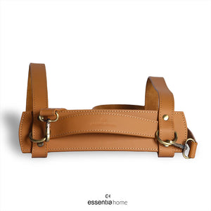 Crafted from premium natural tan leather with brass-toned hardware, it features adjustable straps and carry handles for added versatility and function. The flexible form and secure buckle system make it adaptable for a range of sizes and uses, offering a fuss-free, stylish way to store and carry essentials. Whether resting at the foot of a luxury bed, enhancing a modern entryway, or accompanying outdoor activities, this leather carrier exemplifies the functional elegance at the heart of Essentia Home Furniture.