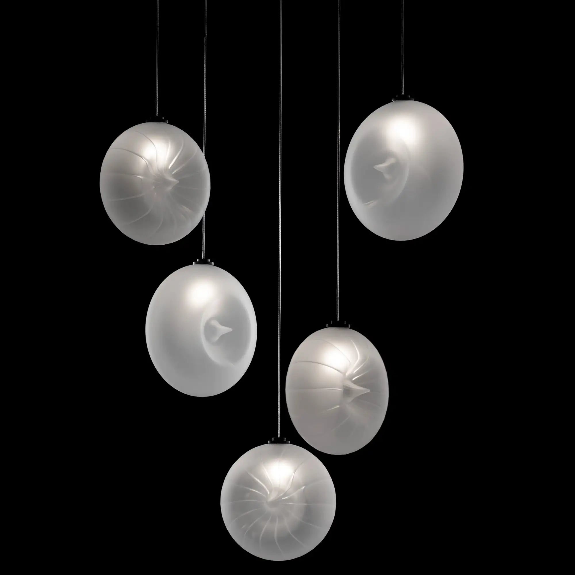 The glass globes vary in fluctuation—an echo of fragile impressions in sand or water—instilling an organic character in the piece. The result is not just light, but rather an interaction with design.