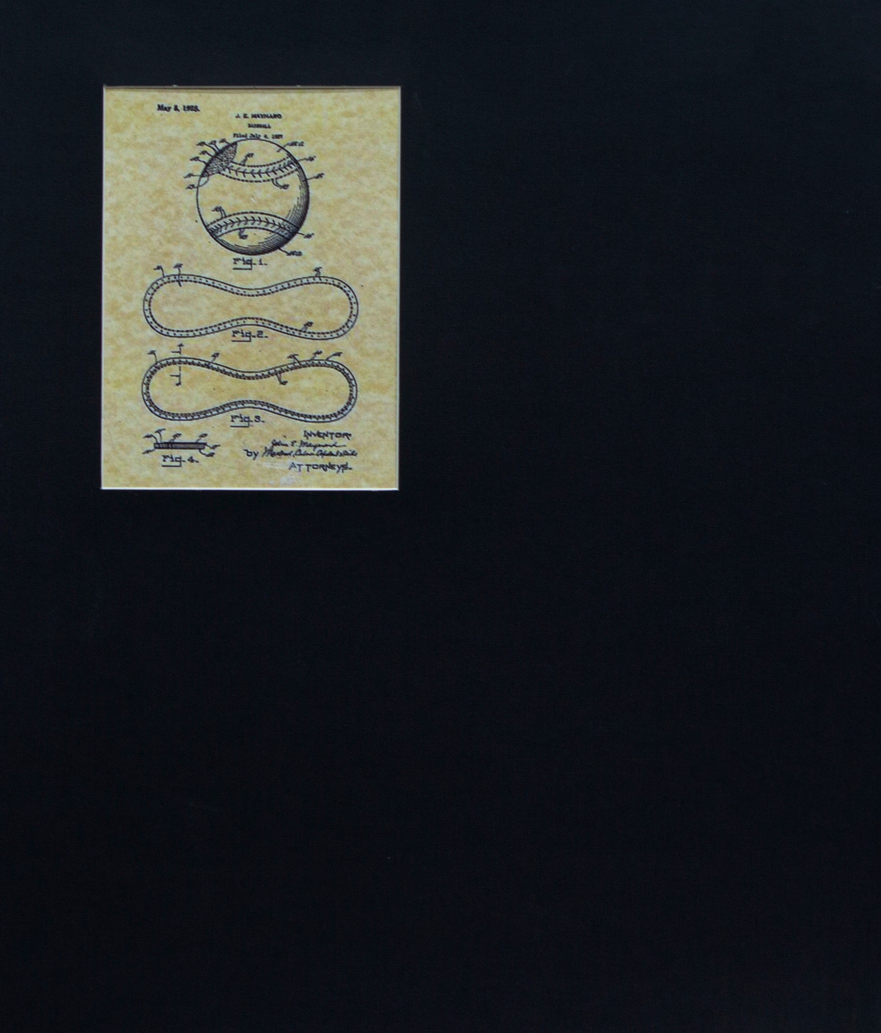 This artwork showcases a vintage patent drawing of a baseball's stitching pattern and flight path, set against a dark background. The detailed illustration emphasizes the scientific precision behind the sport's iconic equipment. The piece explores themes of innovation, the intersection of art and technology, and the timeless appeal of baseball, highlighting the craftsmanship that underpins even the simplest of objects.