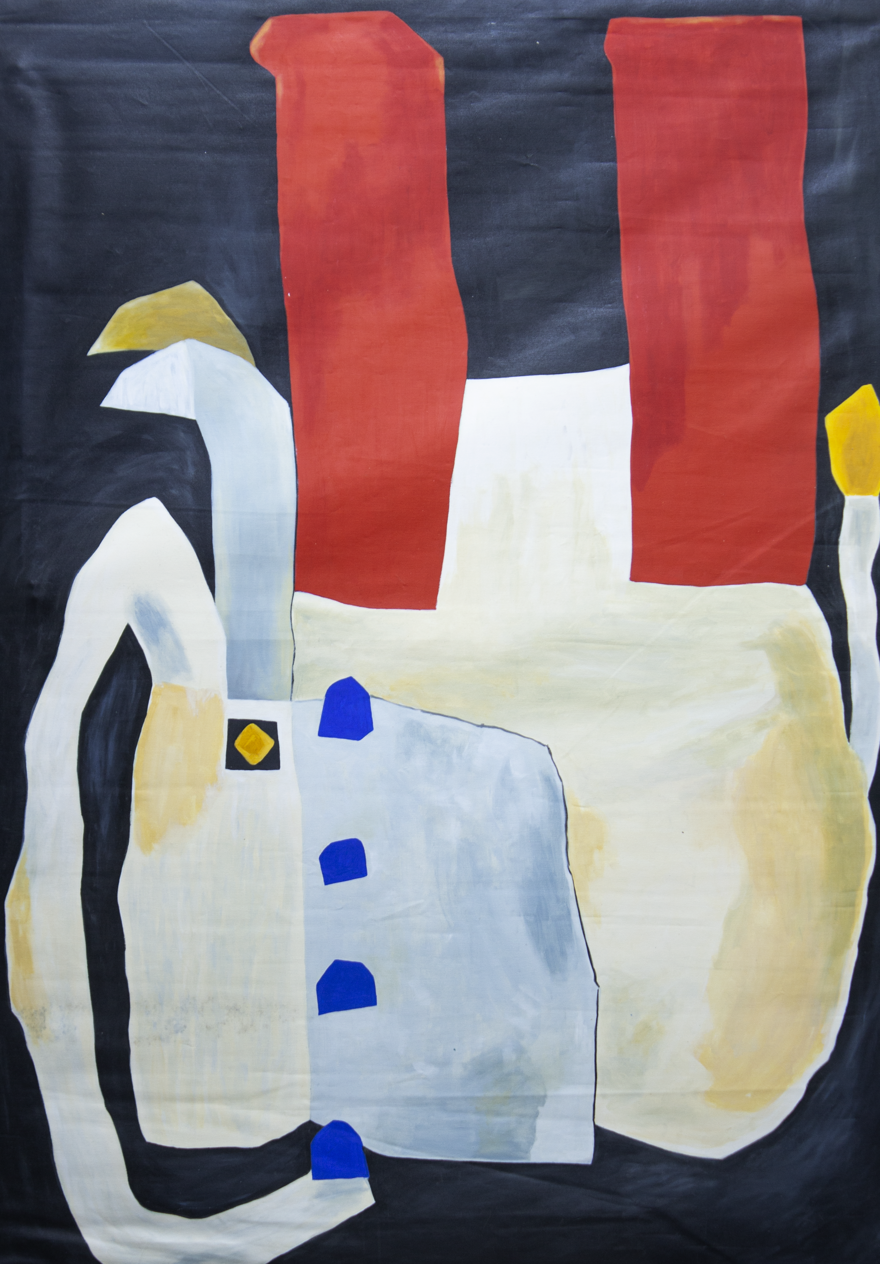 This abstract composition explores the interplay of bold, geometric shapes in red, blue, and neutral tones. The minimalistic design evokes a sense of structural balance and intrigue, inviting viewers to interpret the forms through their own perspectives. The artwork's clean lines and striking colors create a compelling visual contrast, embodying modern abstraction.