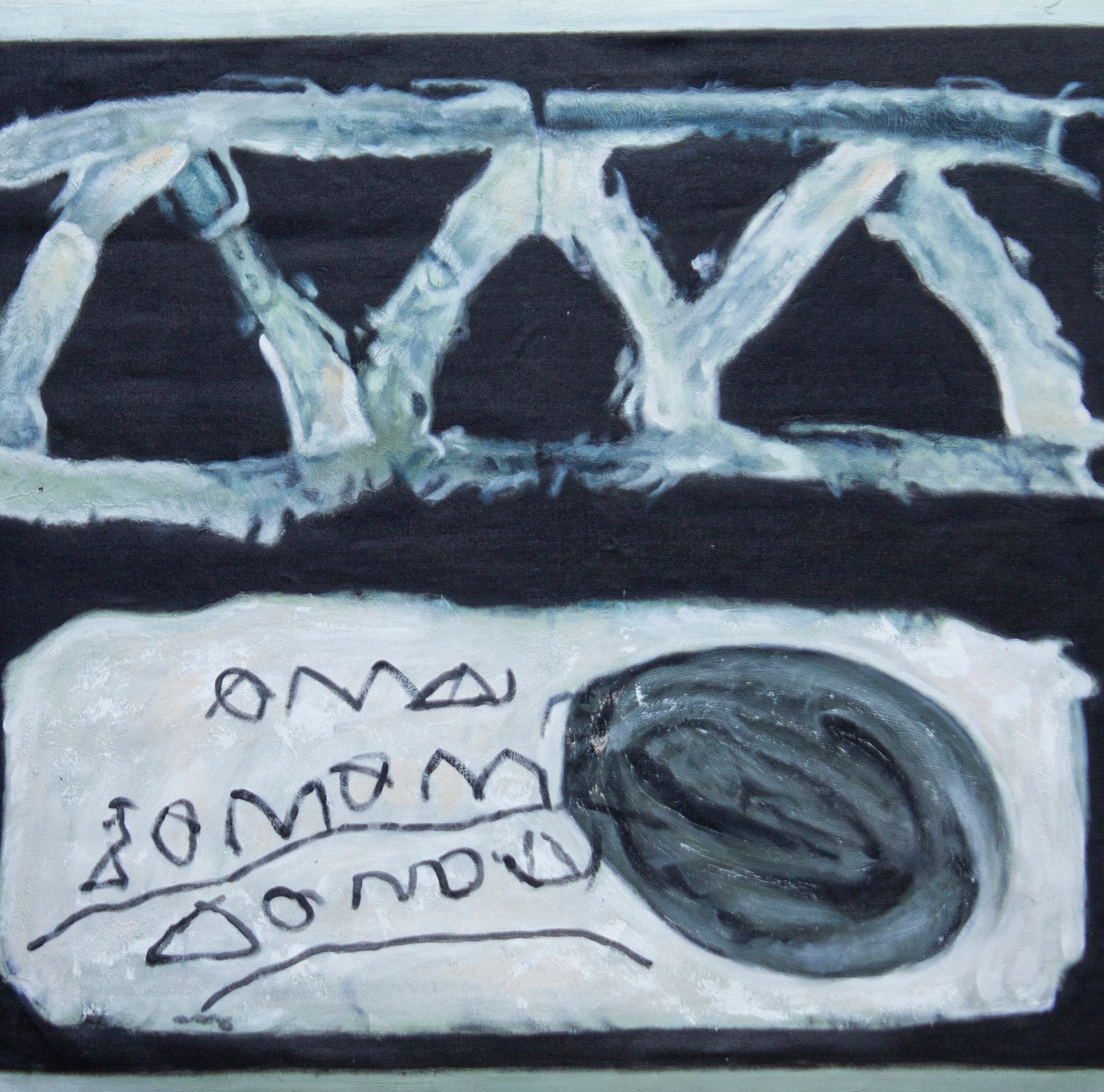 This abstract artwork features a bridge-like structure above a textured, symbolic surface with patterns and an enigmatic dark shape. The interplay of structural elements and abstract symbols evokes a sense of connection and communication. The piece explores themes of crossing boundaries, the flow of ideas, and the meeting point between the tangible and the intangible.