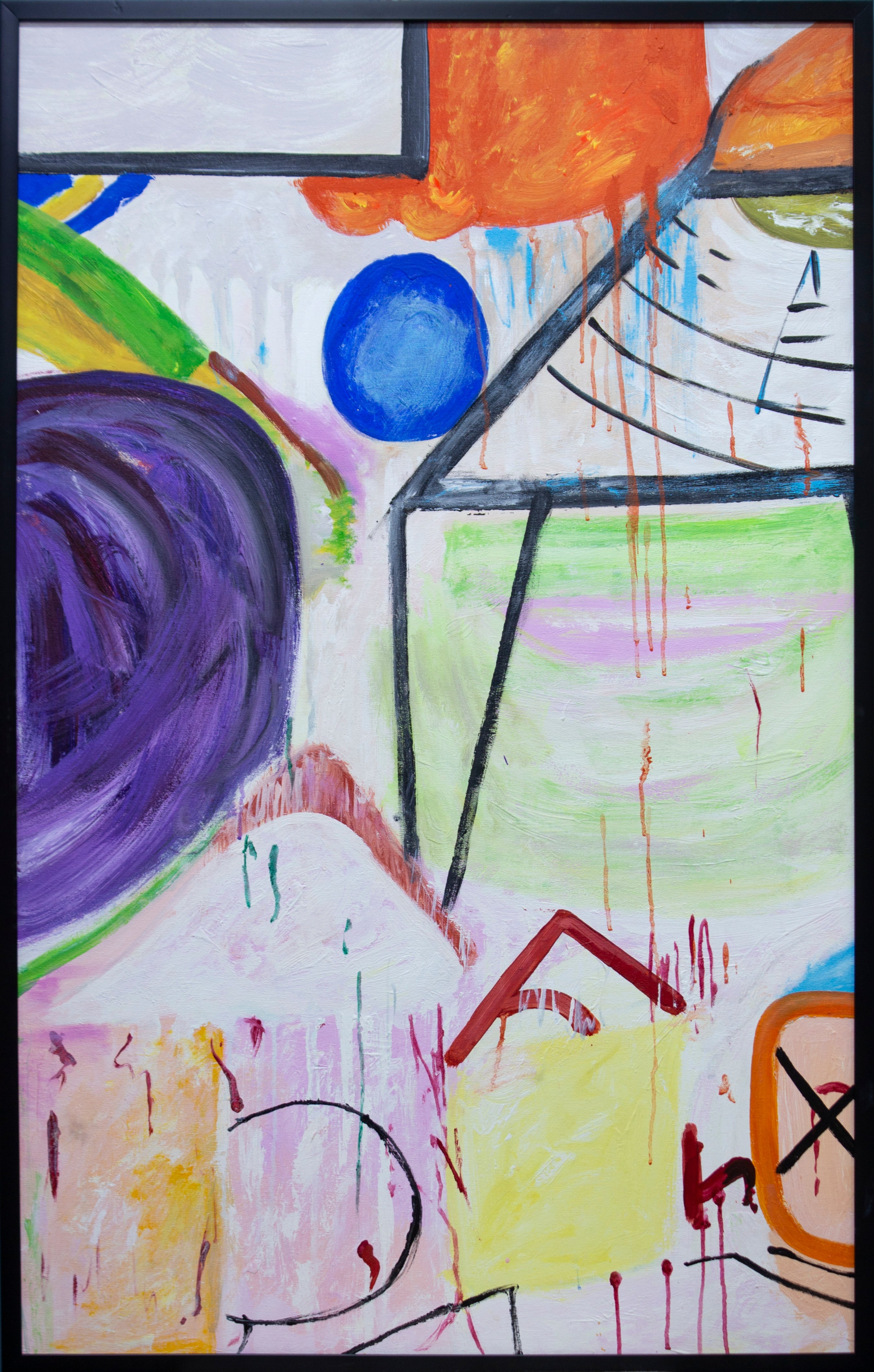 This abstract piece features a dynamic mix of geometric shapes, bold colors, and spontaneous lines, creating a sense of organized chaos. The interplay of circles, squares, and angular forms against a textured backdrop suggests a balance between structure and freedom. The artwork captures themes of creativity, randomness, and the beauty found in life's unpredictable moments.
