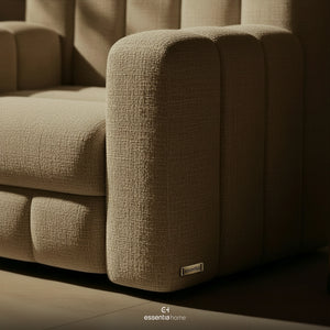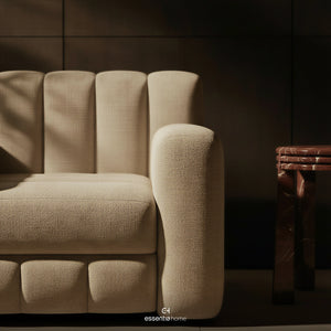 Its continuous cushioned segments bring quiet rhythm to the silhouette while smooth upholstery follows each curve with clarity adding softness and balance to the room.