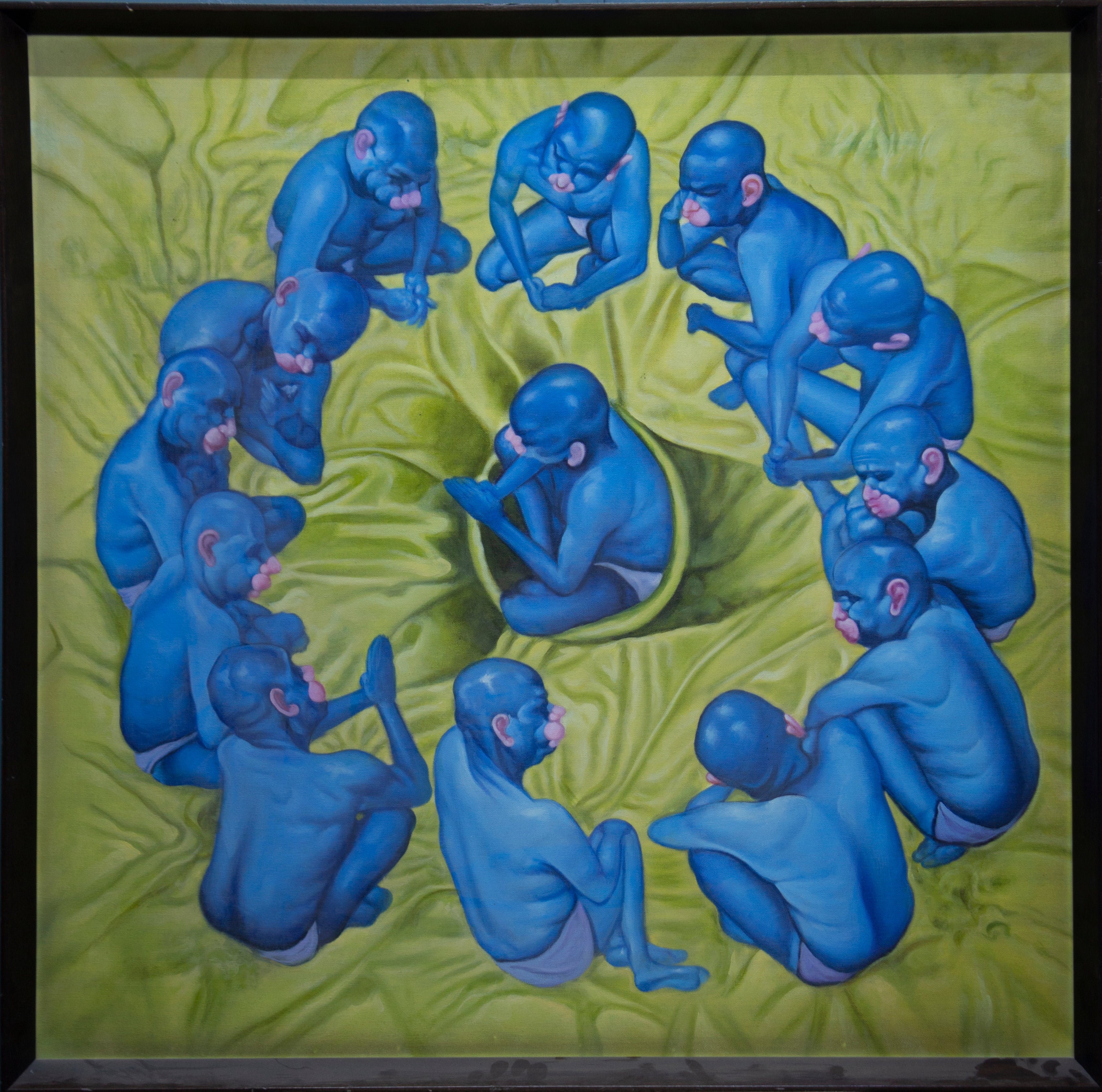 This artwork portrays a group of blue-skinned figures seated in a circle, each in a contemplative pose, set against a textured green background. The circular arrangement and the figures' introspective stances suggest a gathering of thoughts or meditation. The piece explores themes of unity, introspection, and the collective consciousness, evoking a sense of harmony and deep contemplation.
