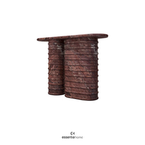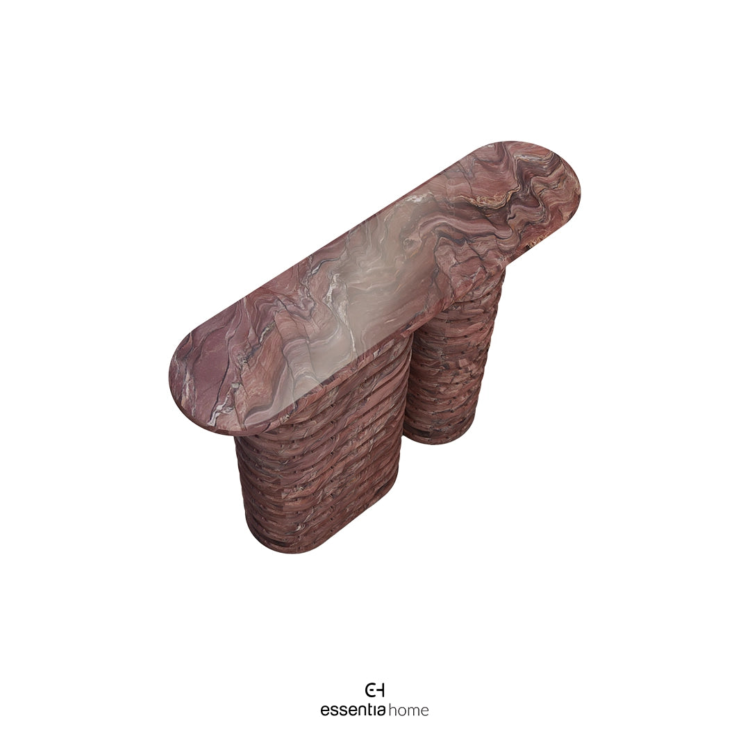 The console is a flowing form organically elegant under the theme of fluidly channeling movement or water by a river. Sculpted from deep-grained Indian stone, its curves remain intentionally fluid-free of angular lines or rigorousness. The idea is that of soft undulations and quiet elegance in the course of a river. In addition, the natural textures and veining of the stone are exposed, allowing the interplay between the deep and beautiful character of the material to dominate the space; the honed finishes only add to this quality of being tactilely and spatially grounded.