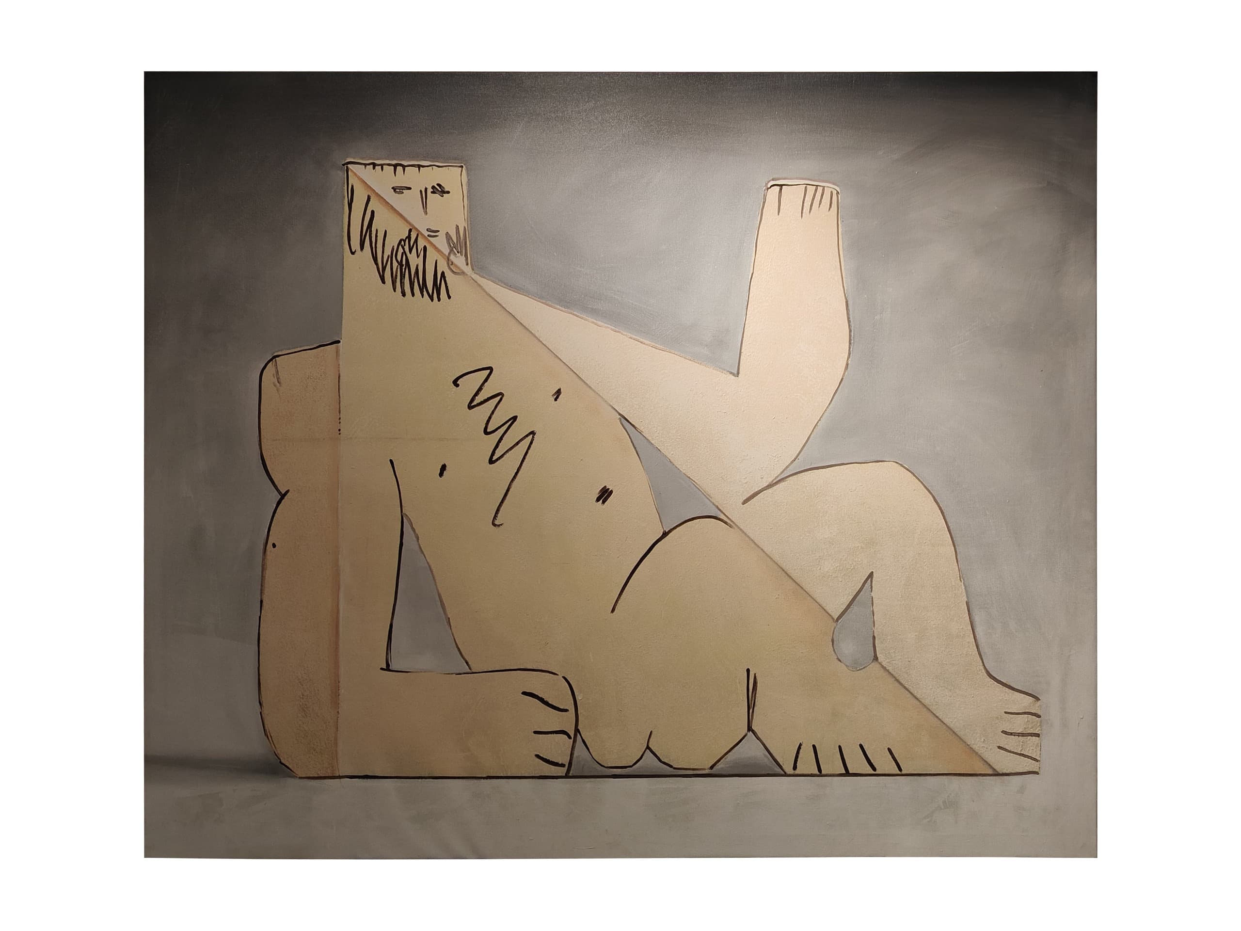 This abstract piece invites viewers to explore the depths of human existence through its minimalist yet powerful design. The artwork's introspective nature and muted tones create a space for deep reflection and thought.