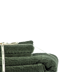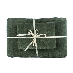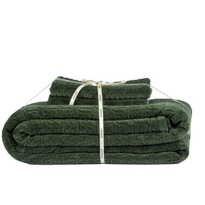 Crafted with care and attention to small details, the set includes a thrown quilt and matching shams, all with expected good finishes with neat-fitted borders. Its earthy olive green color, together with its soft yet heavy appearance, simply and beautifully described the sophisticated Essentia Interiors and Modern Living moods. Create a peaceful retreat with this set as it easily weaves into any of the neutral or earthy spaces, thus broadening its versatility to whatever interior style. From an elegant city loft in Gurgaon to the tranquil haven of a Jaipur retreat or a chic space in an Essentia showroom, this bedding set makes the perfect foundation for high-end, bespoke interiors.