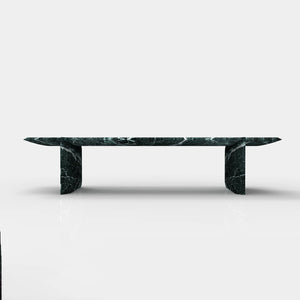 Supporting this masterpiece, the legs are also constructed from Spider Green Marble, ensuring seamless continuity in material and design. The structured silhouette highlights the natural patterns of the stone, creating a captivating interplay between form and function.