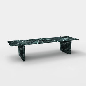 The tabletop is crafted from Spider Green Marble, featuring intricate veining that enhances its visual depth. Polished in a glossy finish, it reflects light beautifully, adding a dynamic touch to its sculptural silhouette. A matte finish option is also available for those preferring a more subdued look.