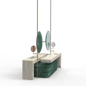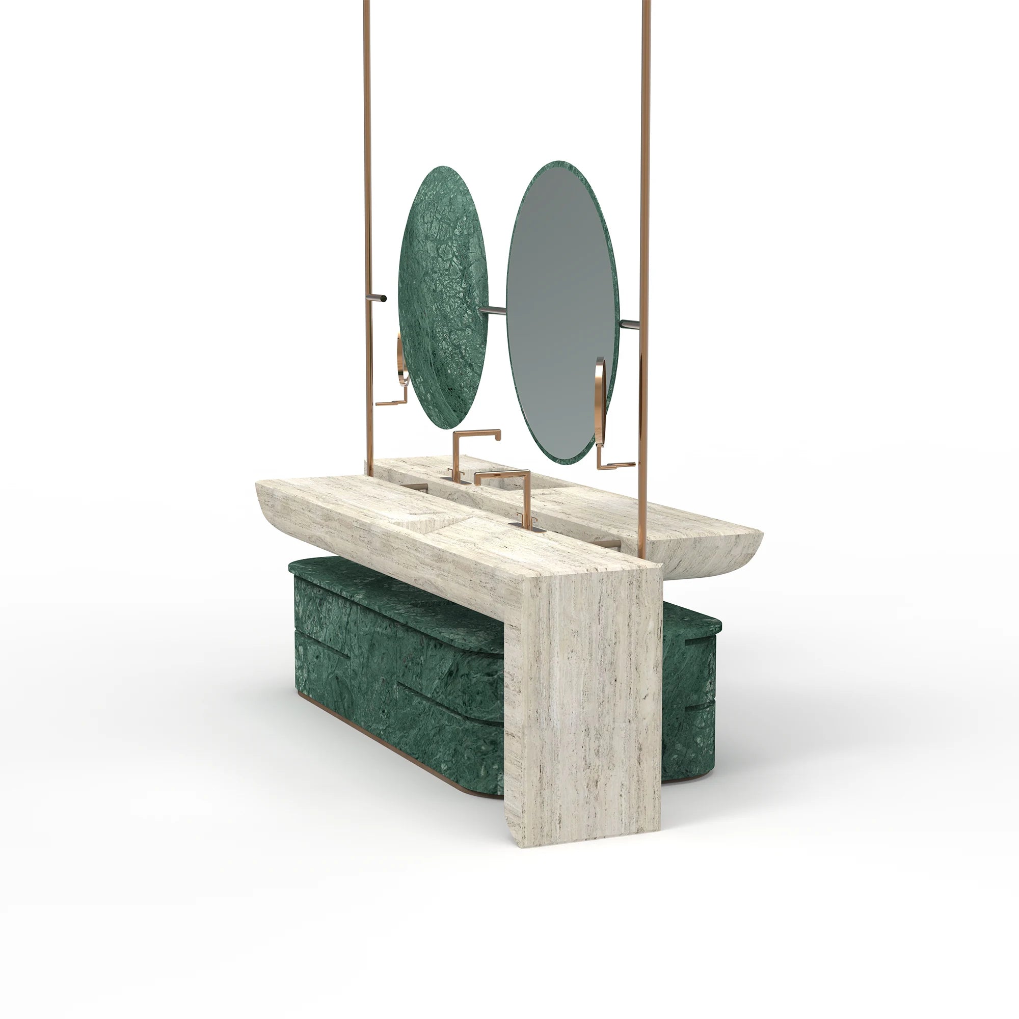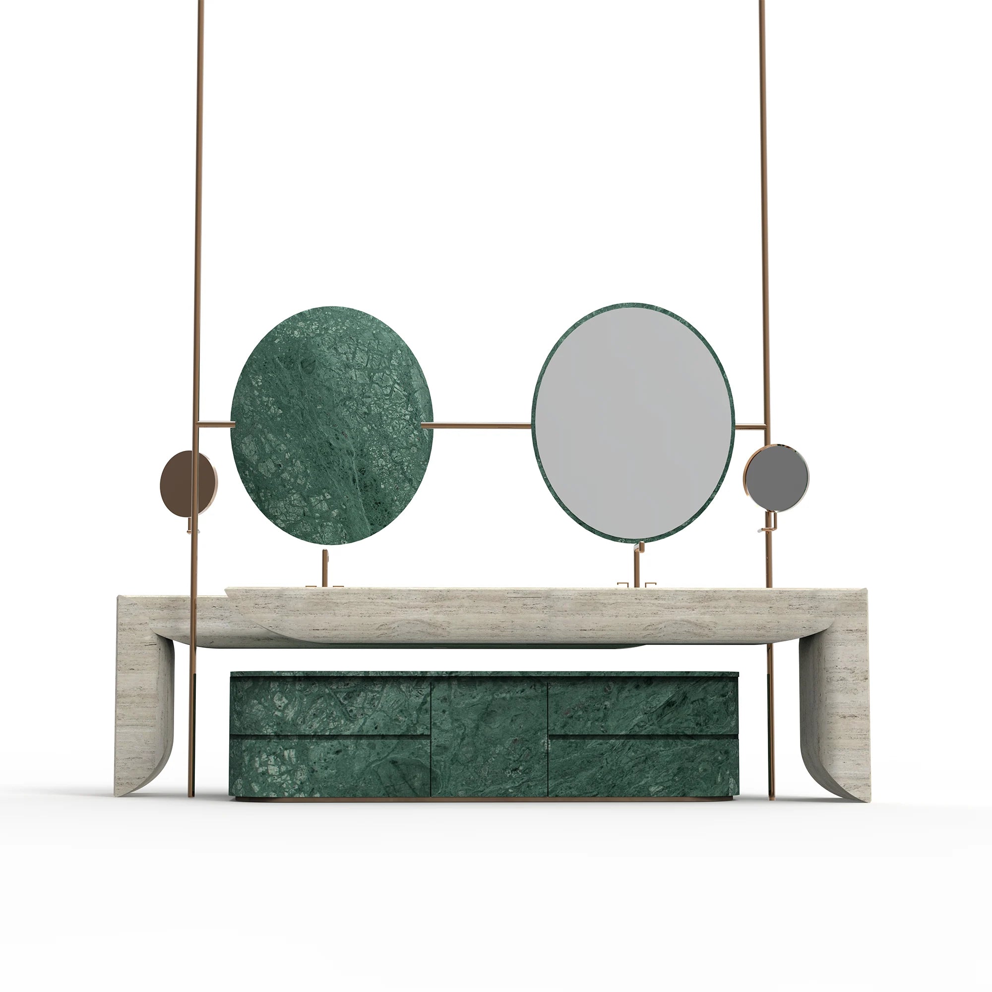 The Crest Vanity is an exquisite statement piece that harmonizes raw materials with refined craftsmanship, offering an unparalleled sense of luxury and function. Designed to elevate personal spaces, it features a sophisticated interplay of stone, metal, and mirrors that define its sculptural presence.