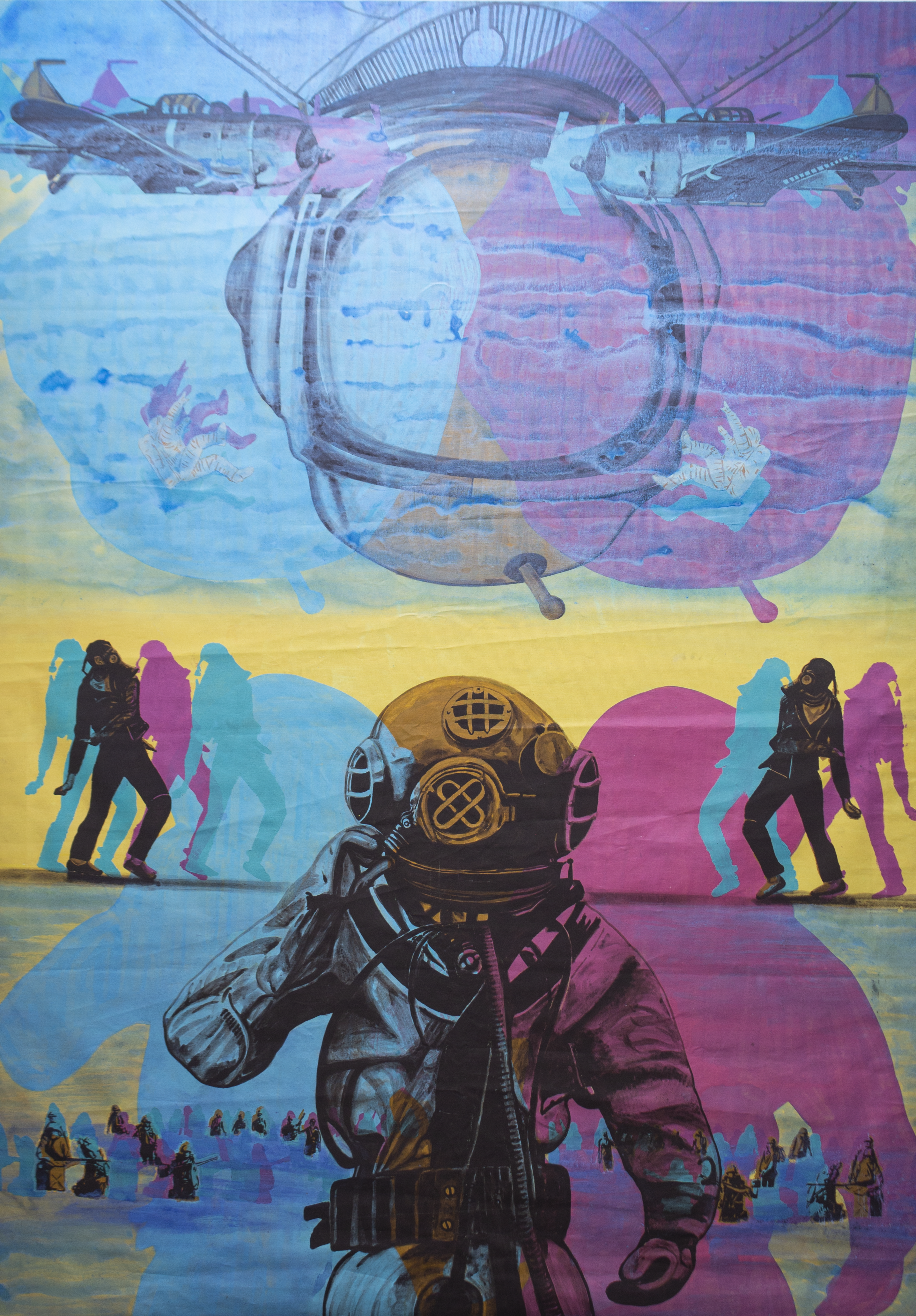 This vibrant piece merges contrasting imagery of deep-sea exploration and aviators. The diver, wearing a traditional helmet, symbolizes mankind's pursuit to explore beyond boundaries. Overlayed figures suggest a dynamic interplay between land, sea, and sky, embodying the unknown realms of exploration. The colors convey a surreal atmosphere, invoking feelings of curiosity and awe.