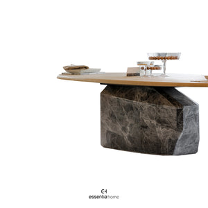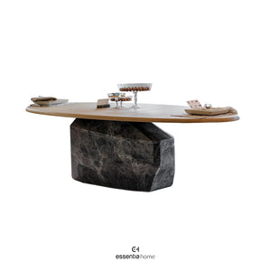 The table's monumental bulk communicates strength and permanence, whereas the smooth and shiny suface adds a quiet softness that holds in check the table's bold structure. This duality-the grounded base, now rise with a refined tabletop-creates a tension that is increasingly felt as a visual in the tension between modernity and timelessness. The silhouette is masculine in its stance but softens with precise craftsmanship and detailing.