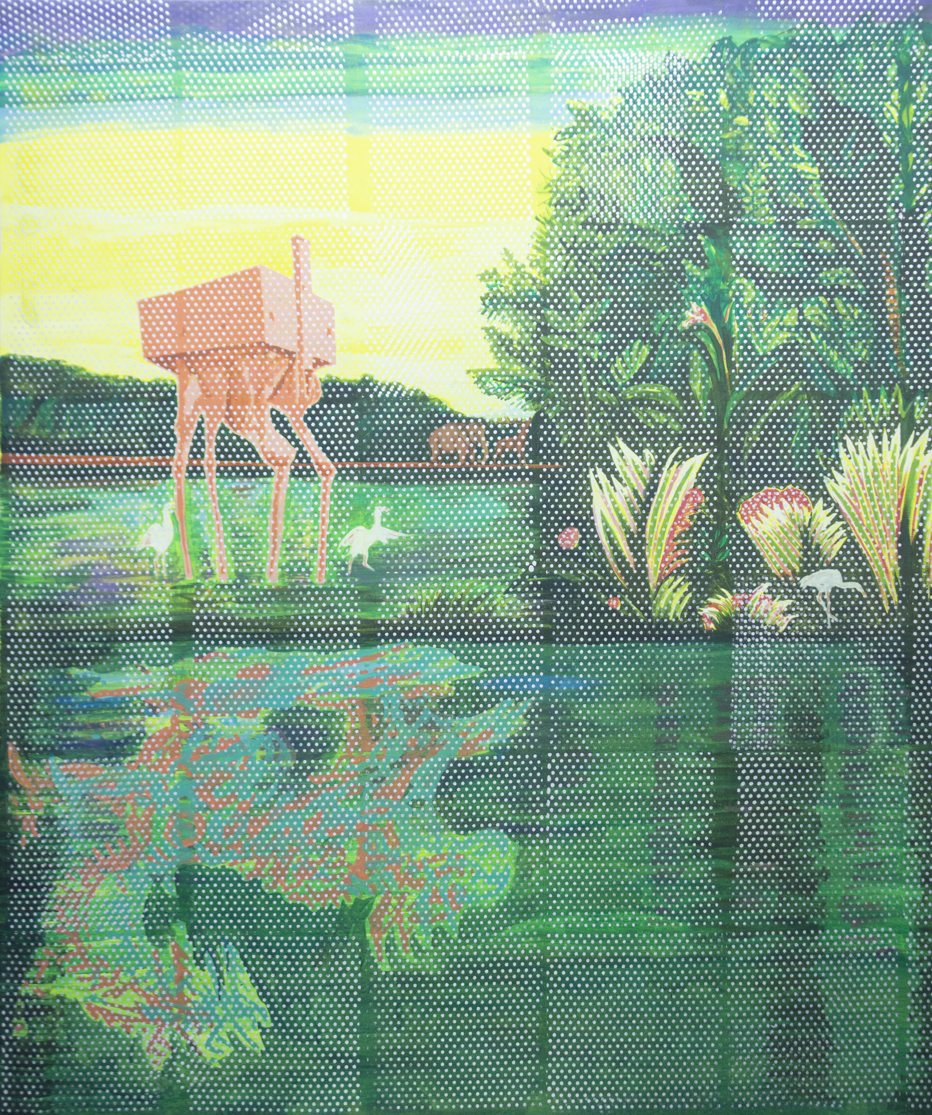 This surreal artwork juxtaposes nature with mechanical elements, evoking a futuristic landscape. The vibrant colors and pixelated textures create a dreamlike atmosphere, blending organic forms with abstract structures. The mysterious figures and reflections invite the viewer to ponder the relationship between the natural world and technology.