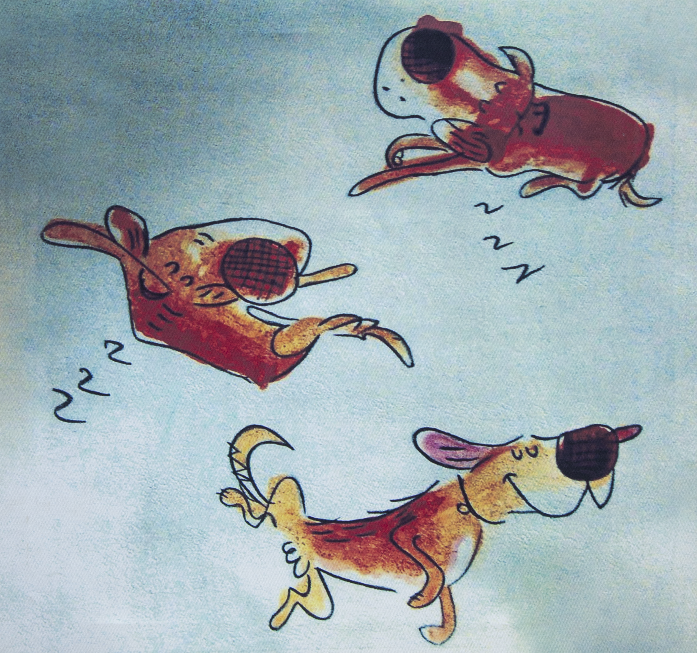 This playful artwork captures the lighthearted and carefree nature of dogs in a dreamlike state. The charming depiction of the three dogs, each in different sleeping positions, reflects a sense of joy and serenity. The piece resonates with pet lovers, bringing warmth and happiness through its whimsical representation of our beloved canine companions.