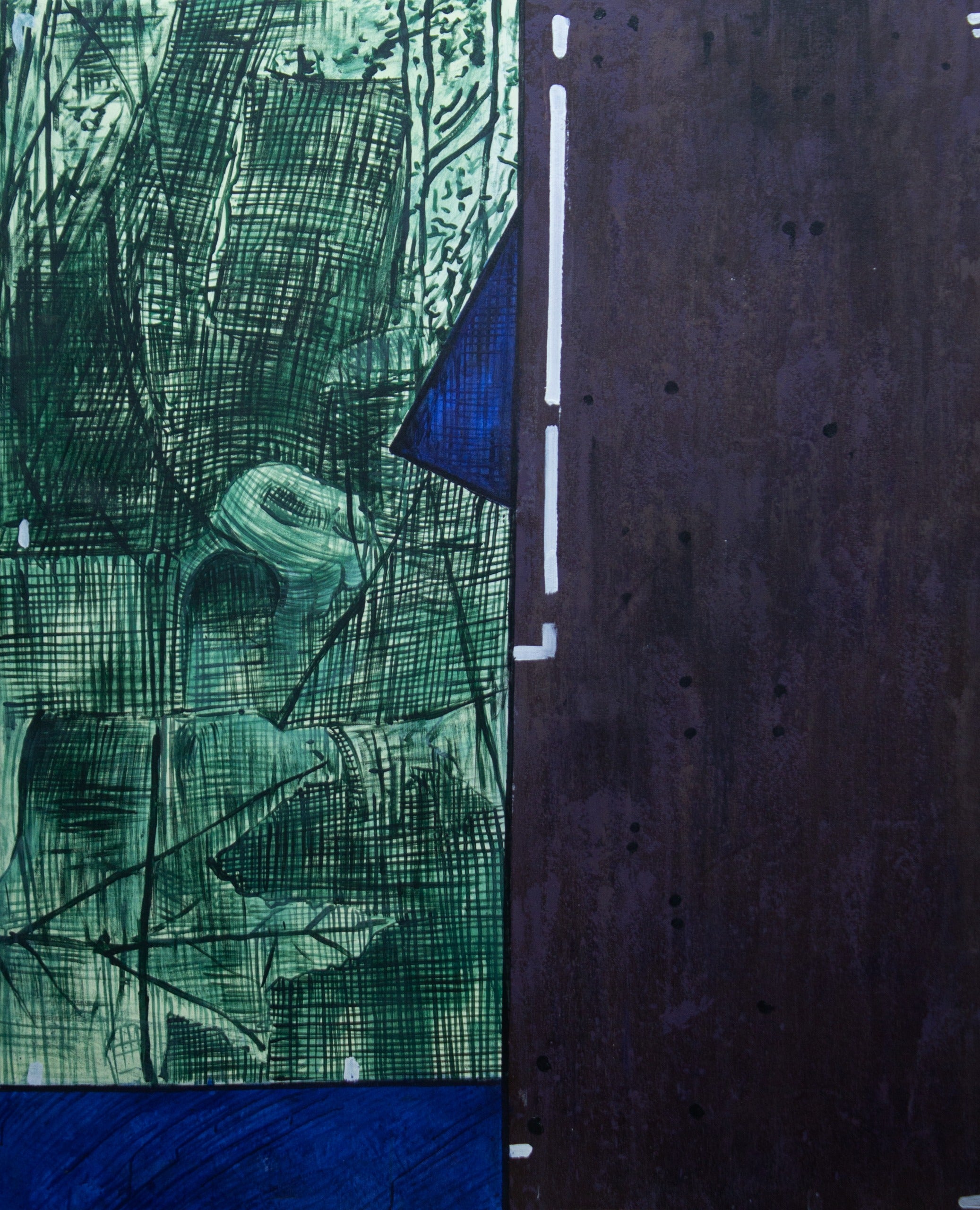 This artwork juxtaposes earthy and organic textures with structured, linear elements. The contrasting color palette of deep browns and vibrant greens, punctuated by geometric lines, evokes a sense of balance between chaos and order. A compelling exploration of texture, form, and abstraction, it invites viewers to delve into its layered complexity.