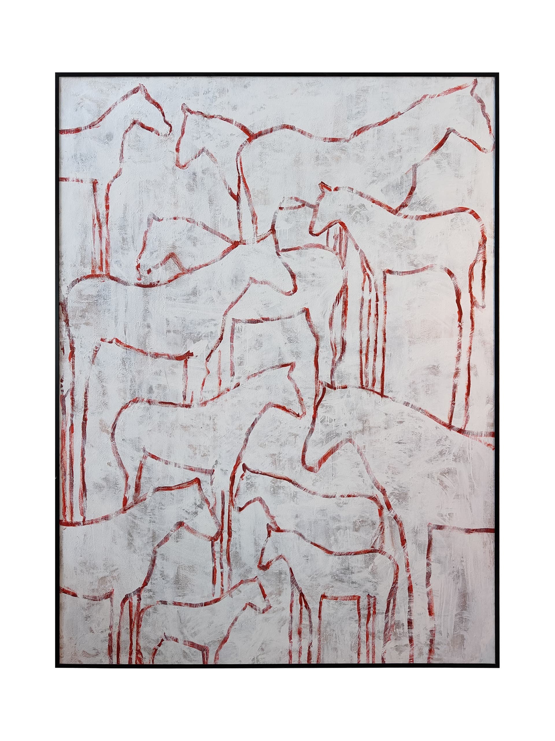 Echoes of the Herd Mural" features a series of red horse outlines against a white backdrop, capturing the dynamic movement and unity of a herd. The layered, abstract composition evokes a sense of continuity and connection, symbolizing the strength and spirit of collective movement. This artwork brings a touch of rustic elegance and vitality to any space.