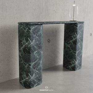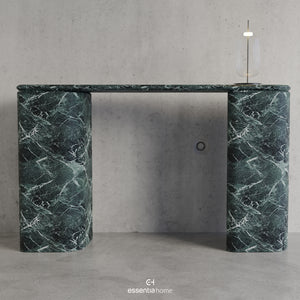 A thoughtful study in form and material, the EH Verde Console Table by Essentia Home redefines minimal luxury. With its softened rectangular top and solid cylindrical legs, this piece combines architectural precision with natural rawness. Designed to anchor transitional spaces, such as hallways, foyers, or behind a sofa, it quietly attracts attention with its clean silhouette and deep green veining. The stone’s organic surface, marked with striking white mineral threads, transforms the console from a functional surface into a sculptural element that enhances both modern and classic interiors.