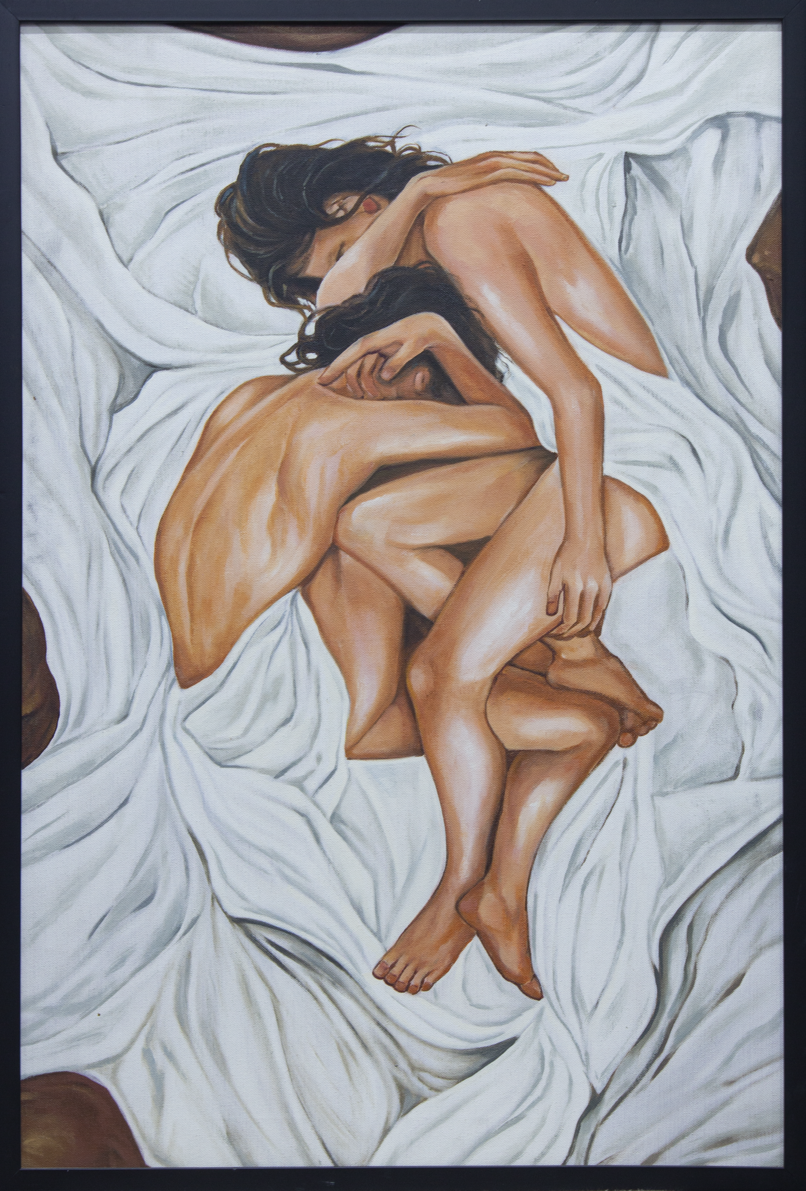 This evocative artwork portrays a deeply intimate and intertwined embrace, capturing the raw emotion of human connection. The flowing white sheets symbolize purity and unity, while the tender, protective posture of the figures reflects love, trust, and vulnerability. This piece beautifully communicates the essence of human closeness and the comfort found in another's presence.