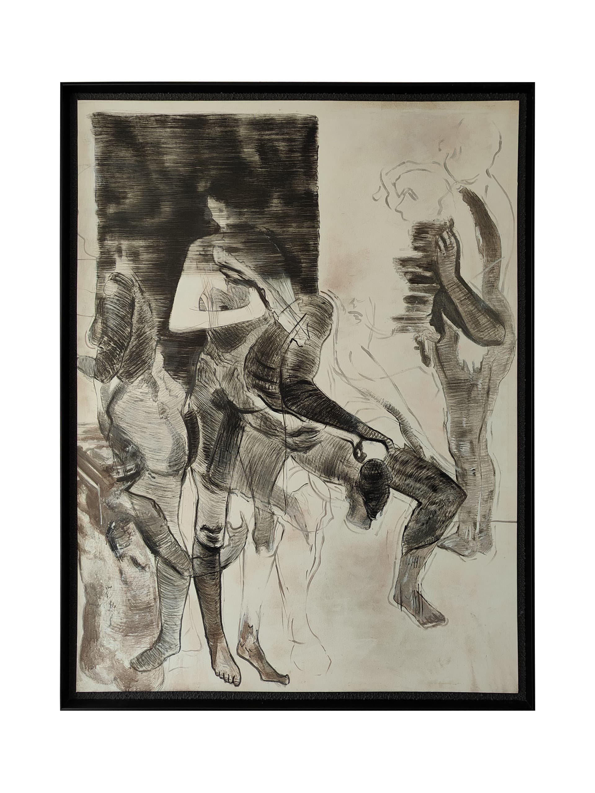 Ephemeral Beings" is a mesmerizing abstract artwork depicting ghostly human forms in dynamic, fluid lines. The piece blends dark and light tones to create a mysterious, dreamlike atmosphere. Figures appear to emerge and fade, capturing the fleeting nature of existence and the transient beauty of human presence. This artwork invites contemplation on the impermanence of life and the delicate balance between seen and unseen realms.