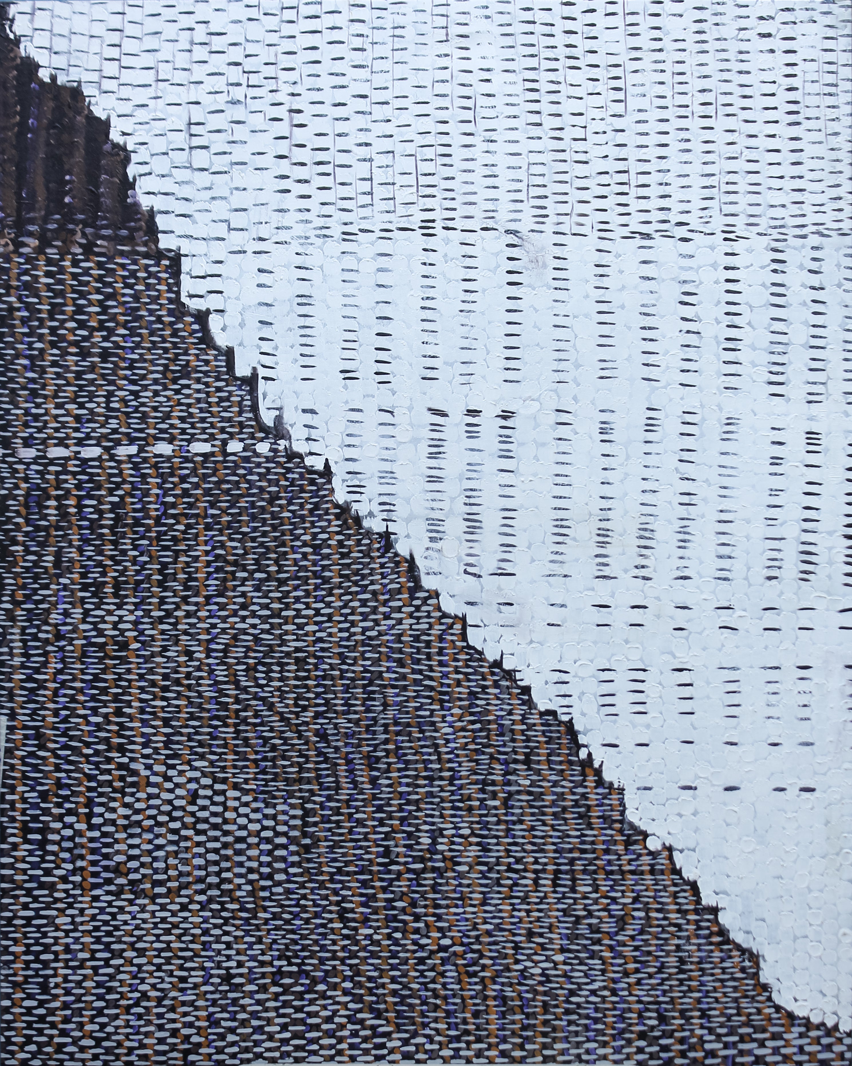 This abstract composition uses a gradient of dense black textures transitioning into lighter, sparse markings, resembling a landscape eroded by time. The artwork captures the essence of natural decay and transformation, suggesting the impact of time on matter. The intricate patterns and minimalist palette evoke a sense of movement and the inevitable change inherent in nature.