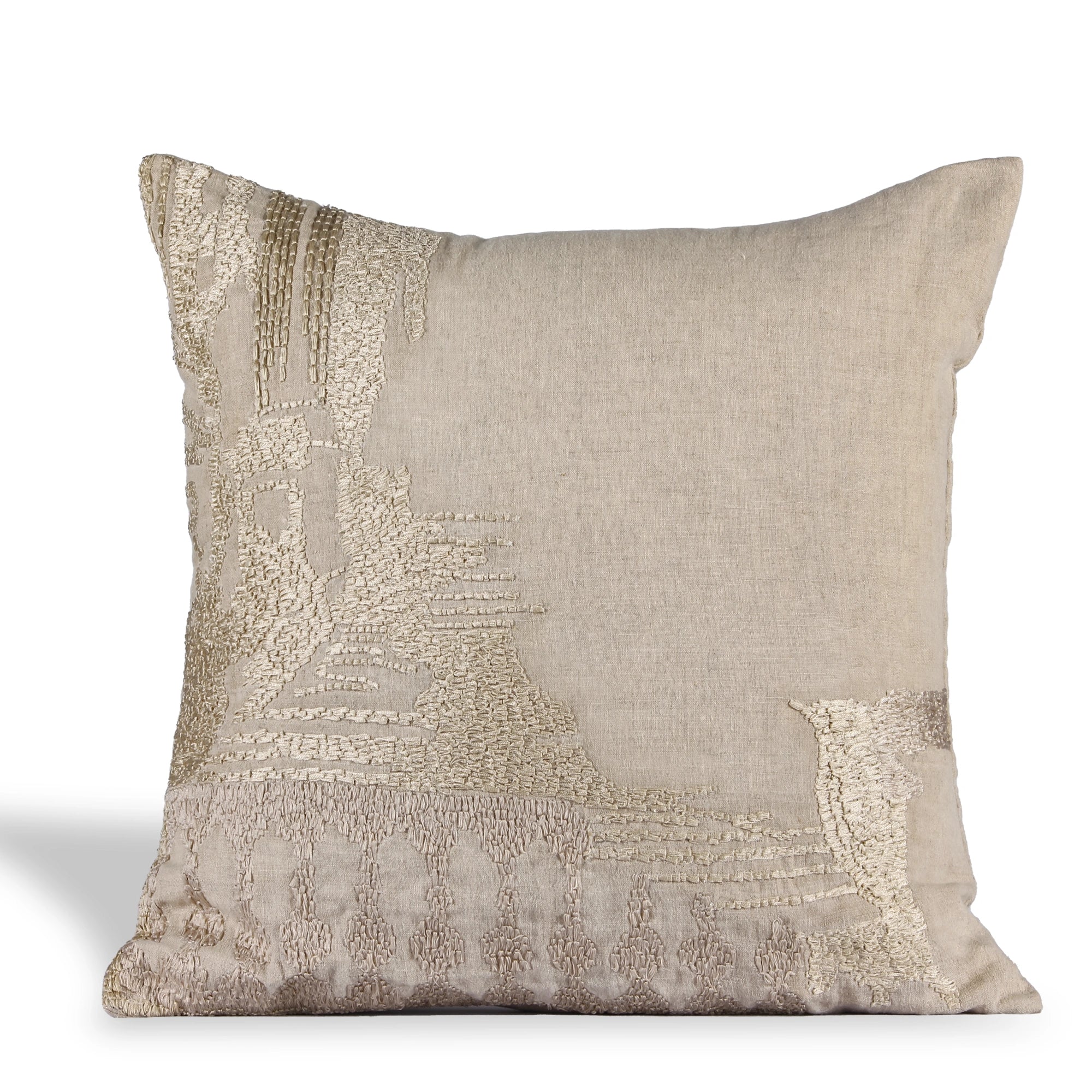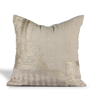 Crafted from premium linen, the cushion embodies subtle sophistication, showcasing artisanal craftsmanship at its finest. The textured embroidery, reminiscent of delicate textiles and handworked patterns, adds an understated richness that complements both classic and contemporary interiors.