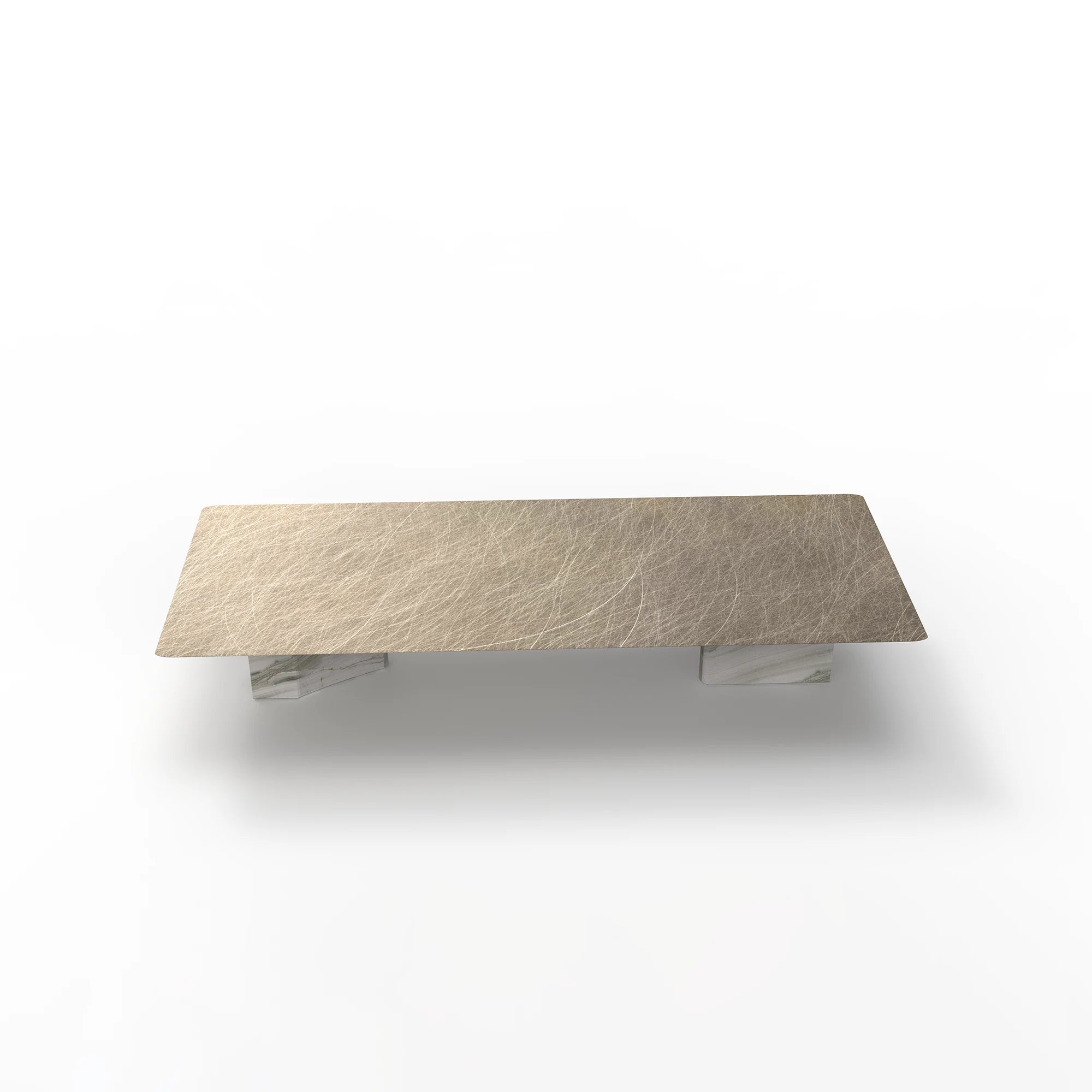 The expansive tabletop is crafted from Ferro Delabre Orbitale Brass, finished in a matte patina that enhances its understated luxury. The metallic surface reflects light subtly, adding depth and dimension to its sleek, modern profile.