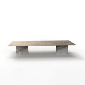 Grounding the piece are Xabia Marble legs in a leather finish, chosen for their organic veining and robust structure. The interplay between the raw stone and the precise metalwork reinforces a sense of strength while maintaining an air of sophistication.