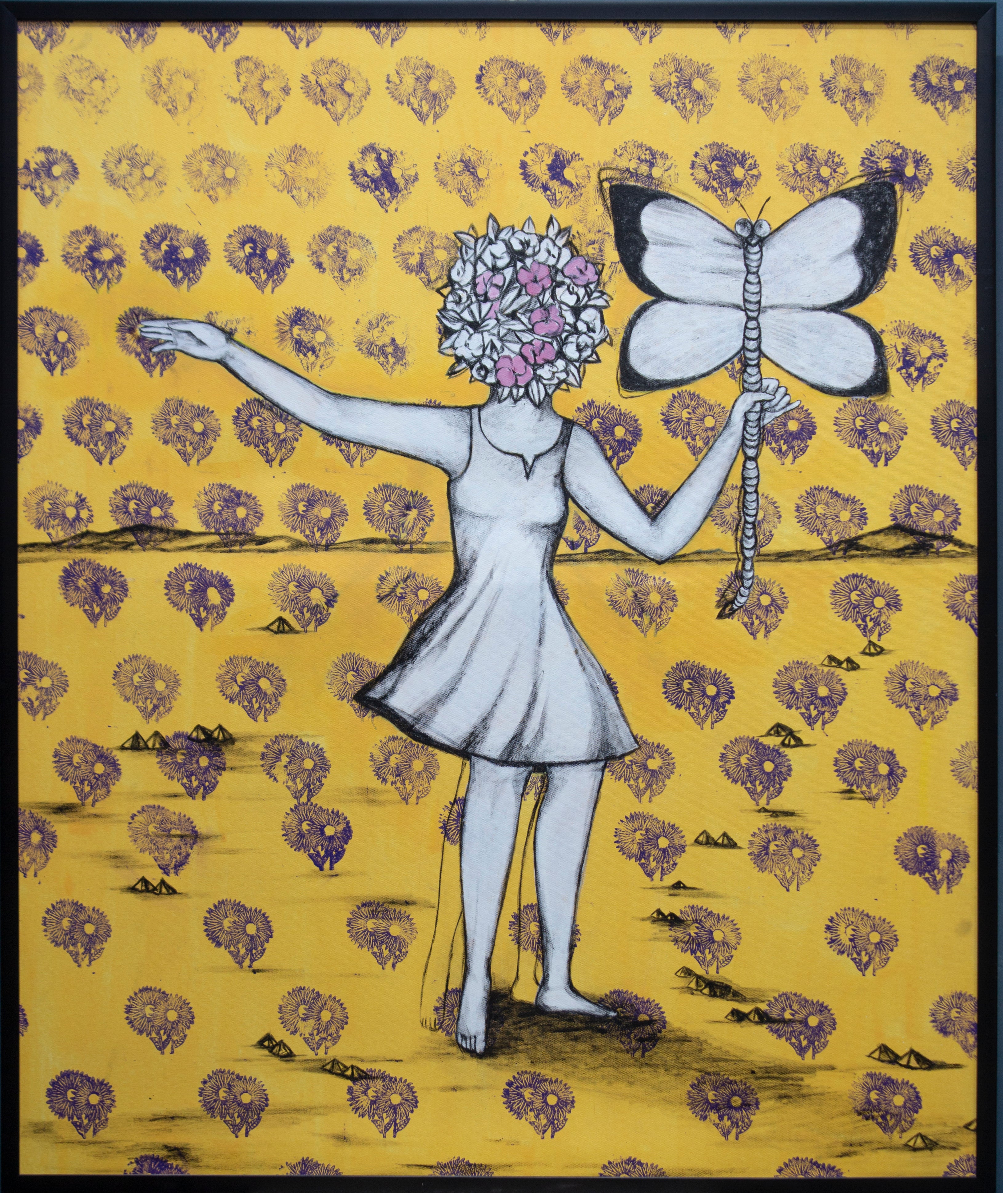 Captivating artwork that symbolizes the union of nature and imagination. The figure, with a head of blossoming flowers, suggests a mind flourishing with creativity and possibility. The butterfly, a symbol of transformation, represents change and renewal. Set against a backdrop of repetitive floral motifs, the painting highlights the beauty of inner growth and the continuous cycle of life, inviting viewers to reflect on their own journey of transformation and the power of nature in inspiring dreams.