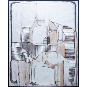 This abstract piece masterfully combines fluid curves and rigid lines, creating a dynamic interplay between form and structure. The neutral tones and subtle textures evoke a sense of calm, while the use of stripes adds rhythm and movement. The composition invites contemplation, drawing viewers into a visual dialogue of balance and contrast.
