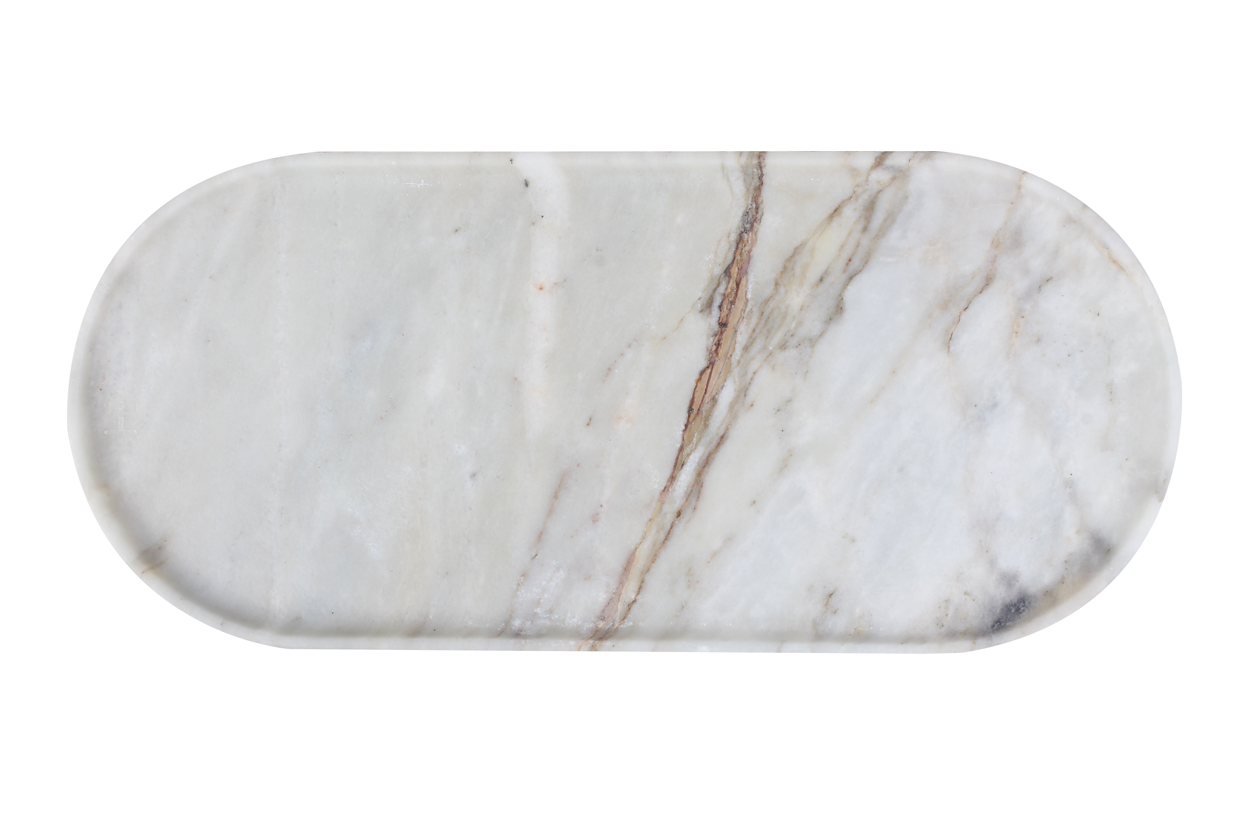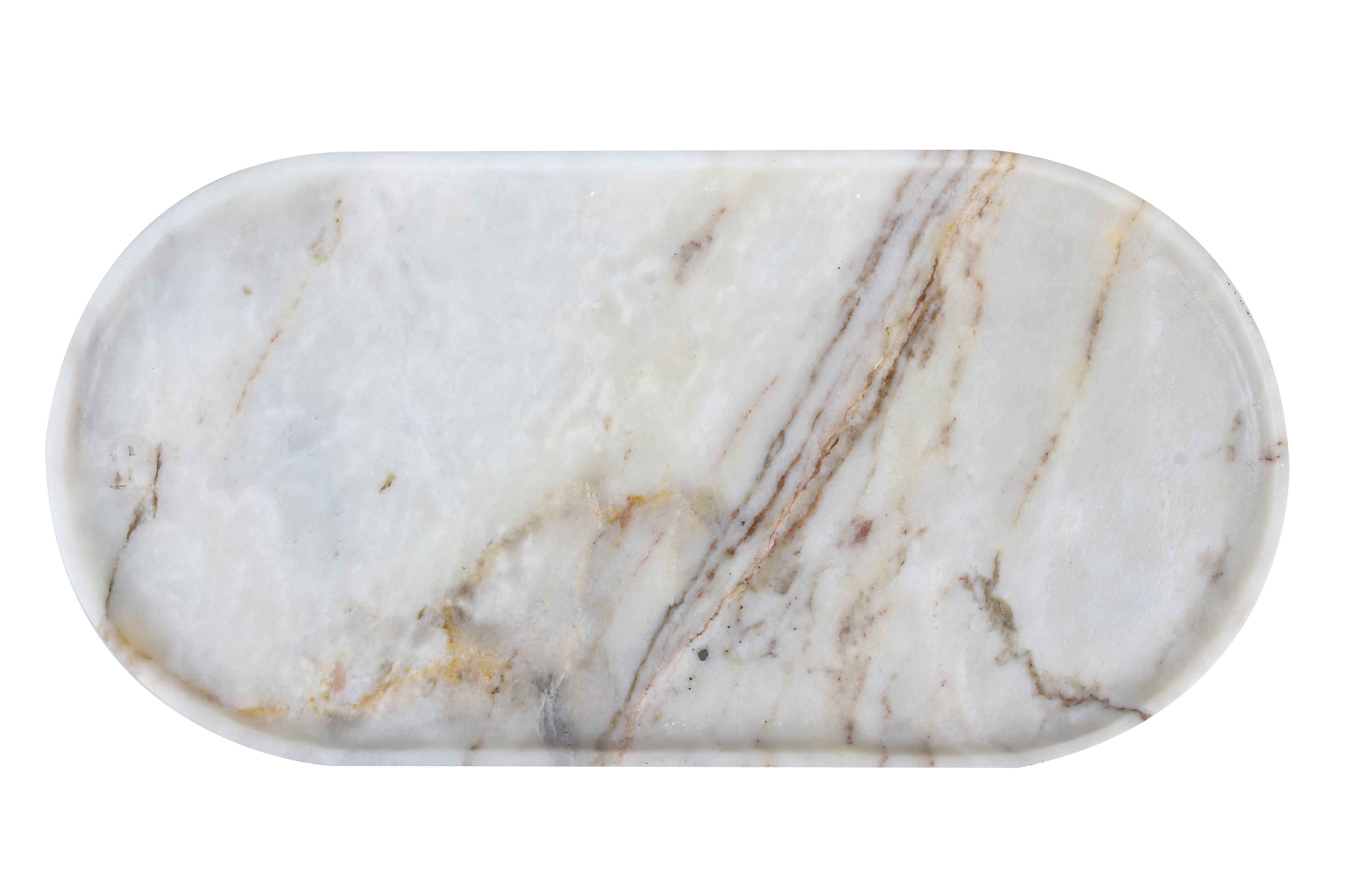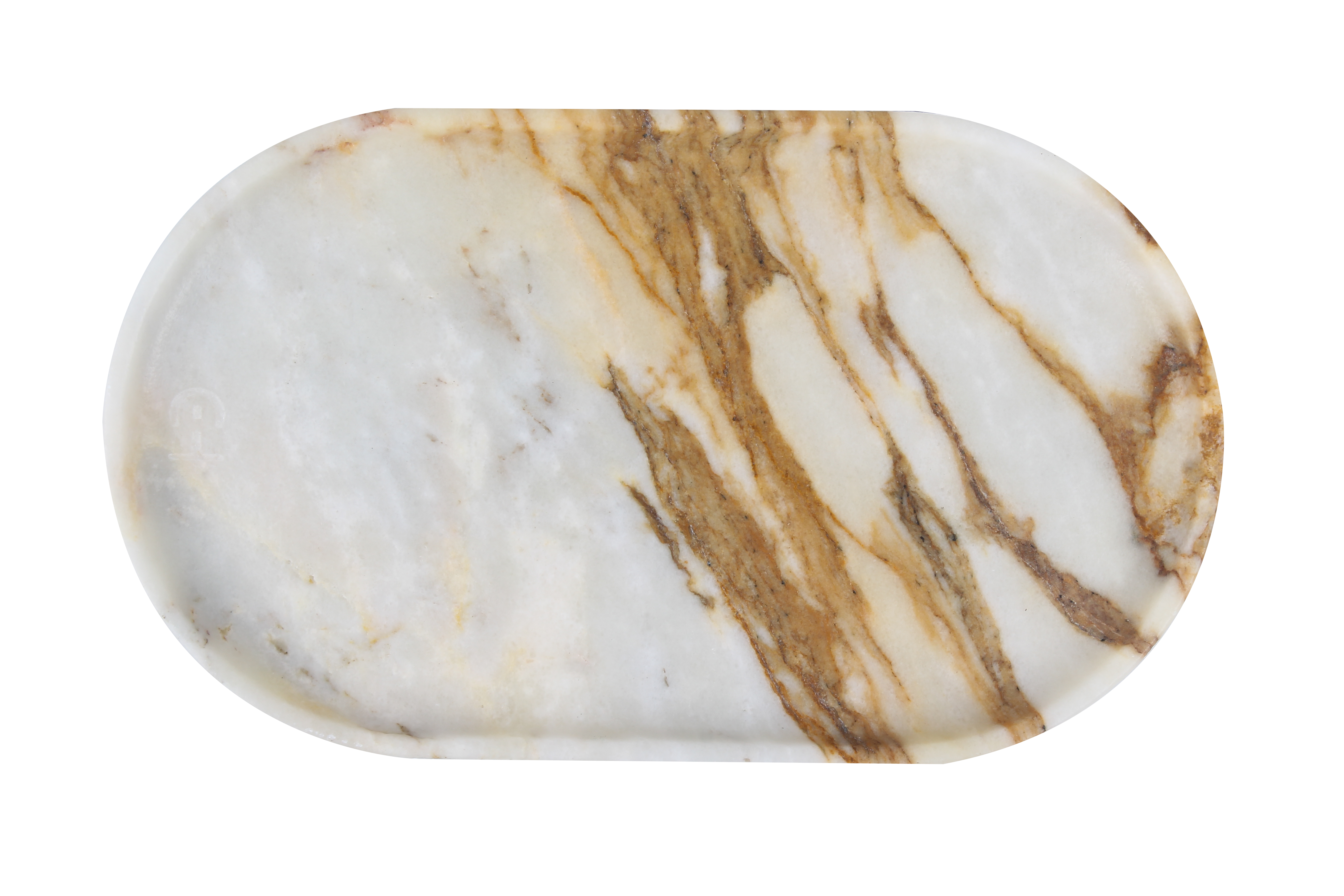 The Golden Statuario Stone Oval Tray reposes luxury within itself, and vis-a-vis nature's grandeur. Subtle and delicate, high-quality white marble is meticulously crafted in such a way that exquisite golden veining falls downwards on its surface and marries itself with very good opposition, thus mirroring an opulence of every kind into any room.