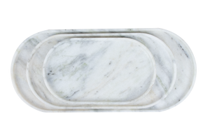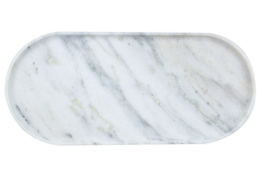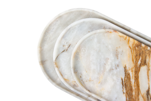 The Golden Statuario Stone Oval Tray reposes luxury within itself, and vis-a-vis nature's grandeur. Subtle and delicate, high-quality white marble is meticulously crafted in such a way that exquisite golden veining falls downwards on its surface and marries itself with very good opposition, thus mirroring an opulence of every kind into any room.