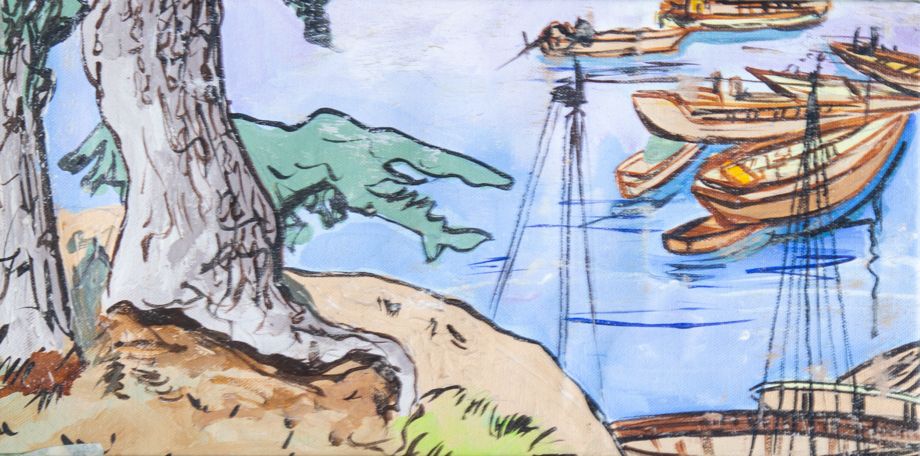 This artwork illustrates a picturesque harbor scene, framed by the sturdy trunks of ancient trees. The tranquil water is dotted with boats, evoking a sense of peacefulness and maritime charm. The soft pastel hues and fluid lines convey a relaxed, coastal atmosphere, making it an ideal piece for spaces that embrace the tranquility of seaside living.