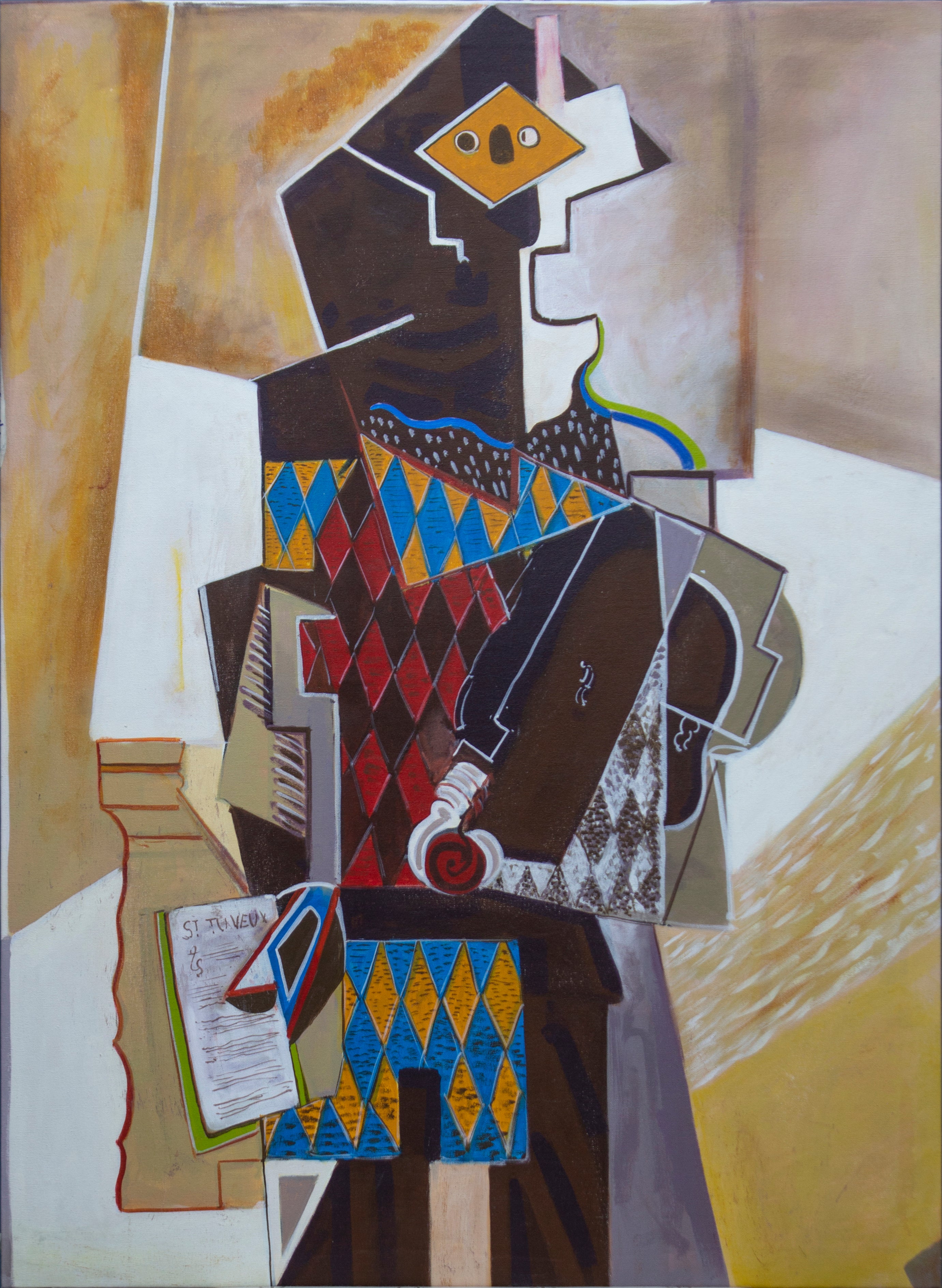 Captures the essence of the traditional Harlequin character through abstract forms and vibrant patterns. The geometric shapes and fragmented lines suggest a playful, multifaceted identity, blending reality with illusion. This painting invites viewers to explore the dualities of self-expression and the complexity of personas.