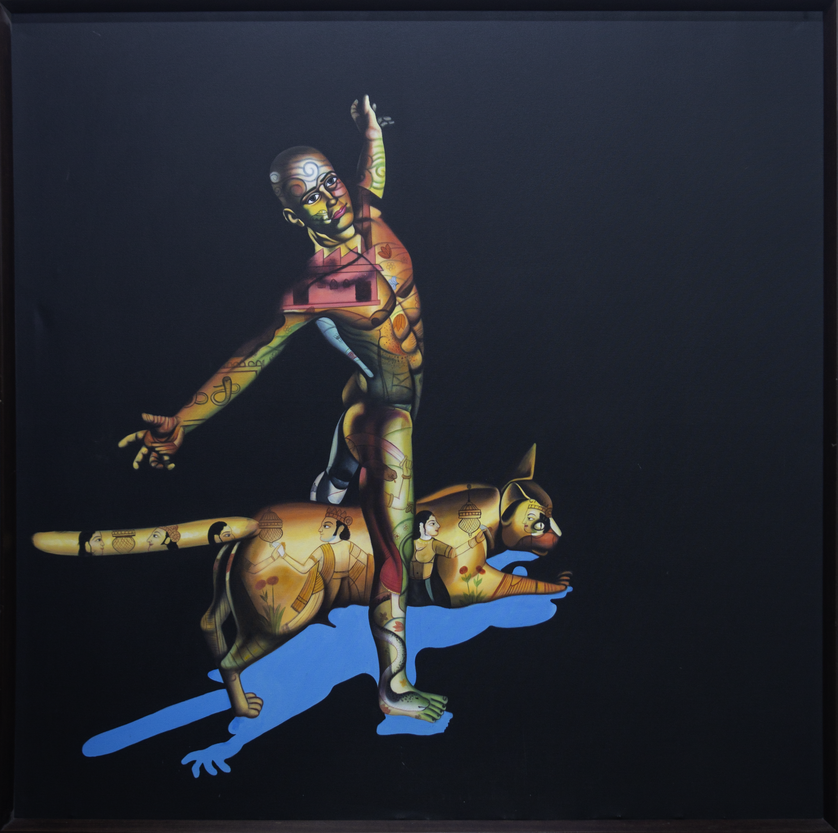 This striking piece fuses dynamic motion with intricate cultural symbolism. The vibrant figure, intertwined with abstract designs and a feline companion, captures the essence of balance, fluidity, and identity. Against a stark black background, the artwork evokes a deep sense of exploration between body and soul, human and animal, creating a captivating visual dialogue.