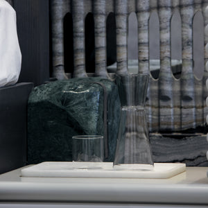 Funnel-shaped tapering gives this clear glass HIGH RISE Pitcher a modern and sleek charm. Ideal for serving water, juices, or cocktails, it truly brings in some contemporary lines, making it a great complement to any dining table or kitchen. Smooth edges and a minimalist style command attention on the table and are functional.