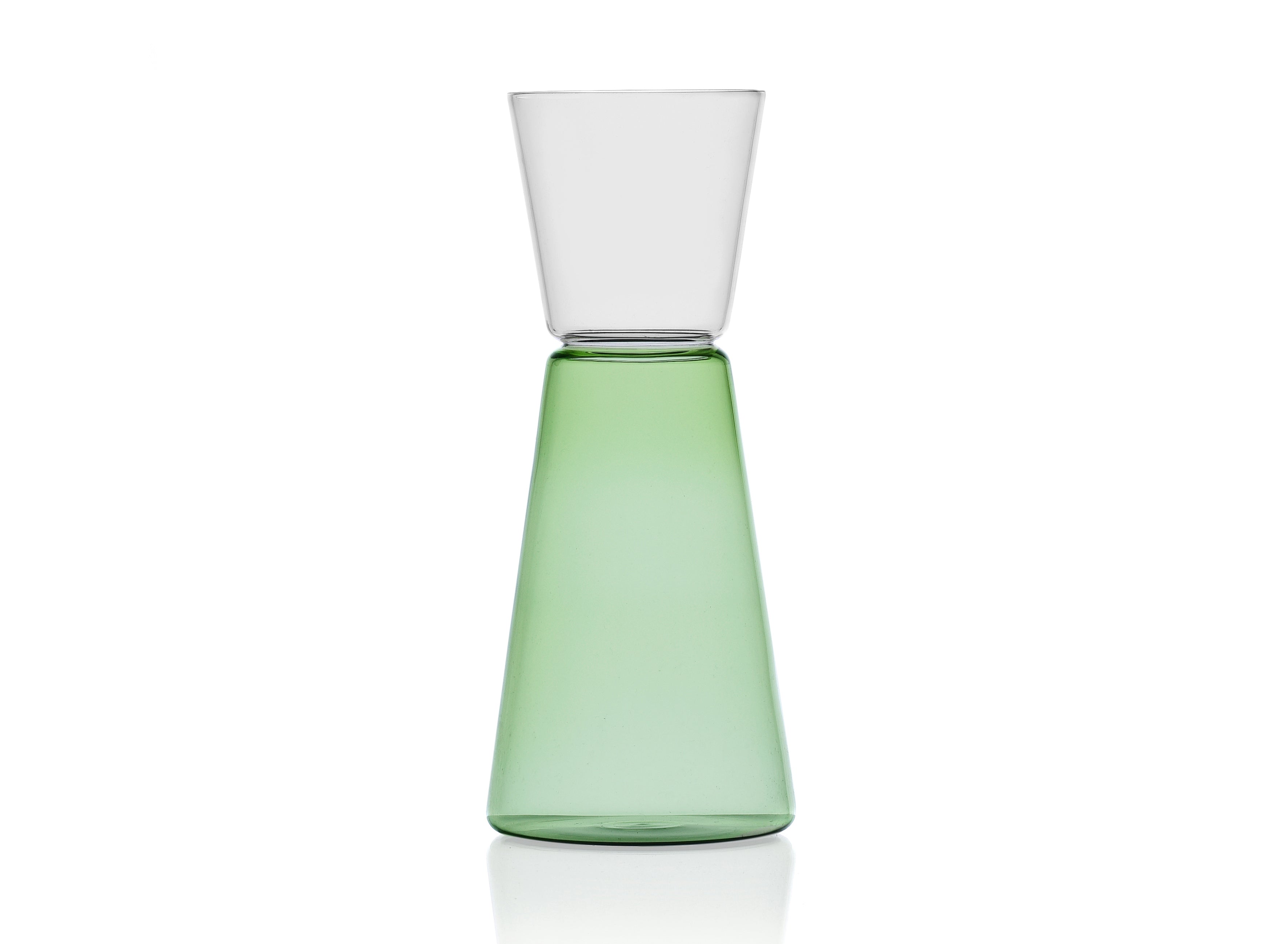 The HIGH RISE Pitcher Green/Clear 750 ml is modern glassware combining style and function. Its matte green conical base and clear flared top lend a contemporary feel to your table. Use it for drinks or a decorative element; the pitcher adds glam finish to any setting.