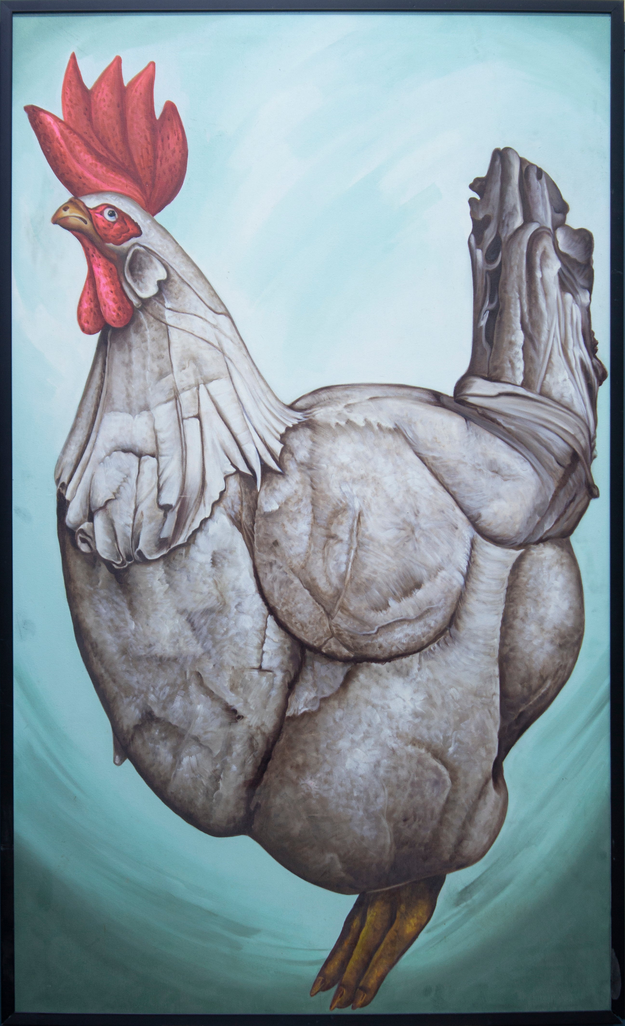 This artwork features a rooster with a body resembling metallic machinery, blending natural and industrial elements. The contrast between the rooster's organic head and the mechanical body suggests themes of nature versus technology, the impact of industrialization, and the merging of organic life with artificial constructs. The piece provokes thought on modernization's effect on traditional symbols of rural life.