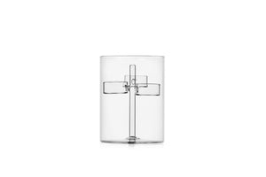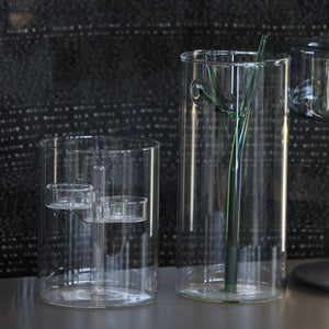 The IRIS Tealight 3 Cand. Clear is a transparent cylindrical form with a central clear crossbar and holds three tealight candles. Perched on a minimalist sophistication pedestal in various settings, it knows how to create a lively atmosphere. The sleekness of the design and the subtlety of the clear glass make the candles glow and shine, adding magic to any room.