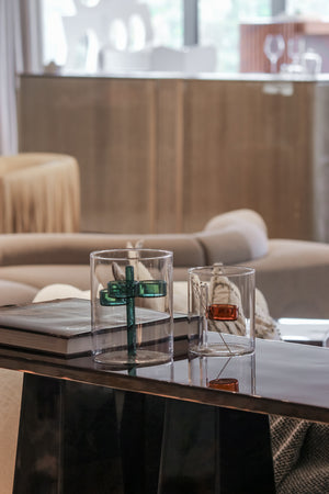 This sophisticated IRIS Tealight 3 Cand. Petrol holder features a clear cylindrical design with a central petrol-colored crossbar, elegantly holding three tealight candles. It is a pretty decor piece to create a cozy and stylish atmosphere in any space. The contrast between the clear glass and the petrol crossbar enhances the beauty of the flickering candlelight.