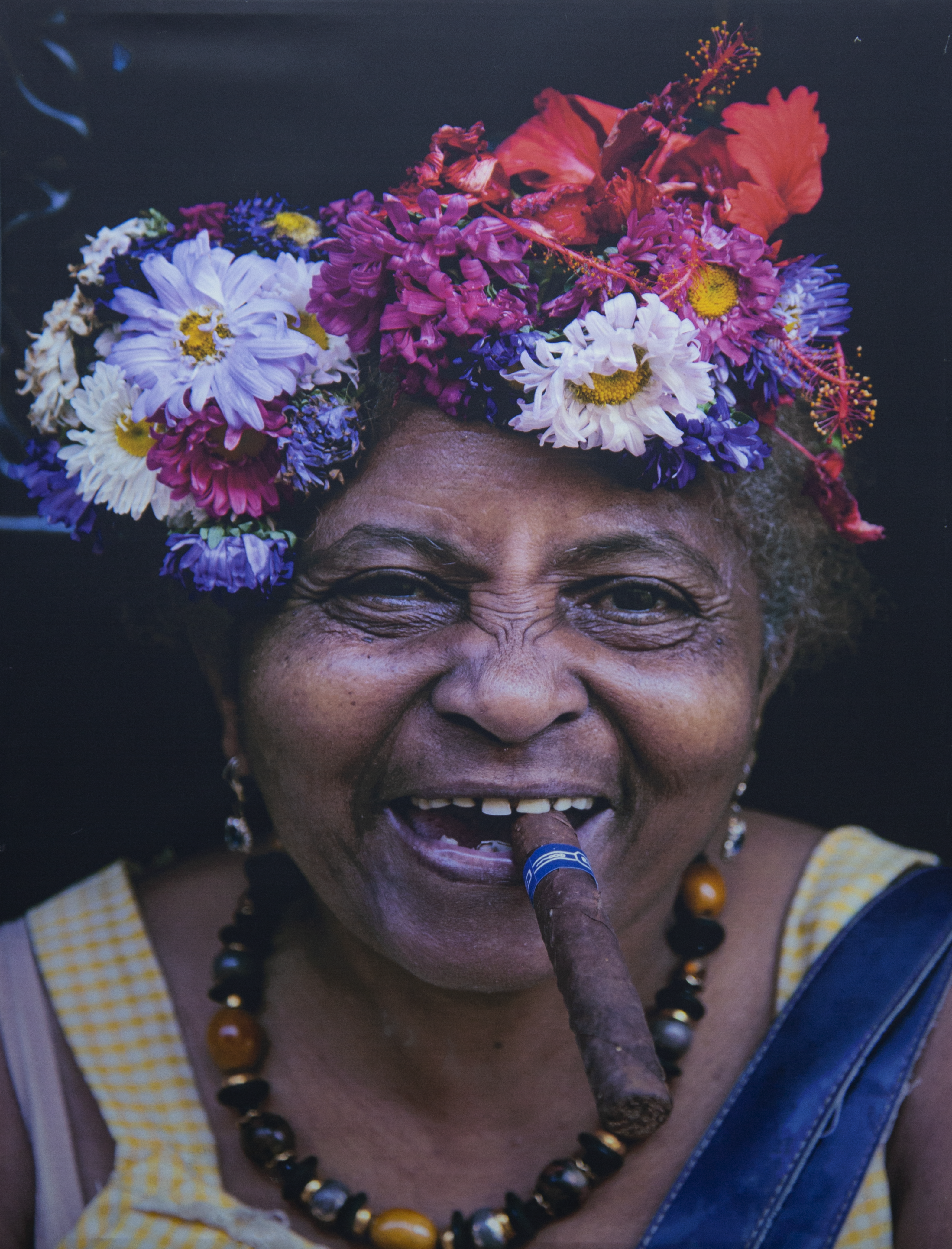 This captivating portrait radiates joy and resilience, showcasing a woman adorned with a vibrant crown of flowers and smoking a cigar. Her expression, full of life and character, reflects a celebration of culture, individuality, and the beauty found in authenticity. The striking colors enhance the vitality of her spirit.