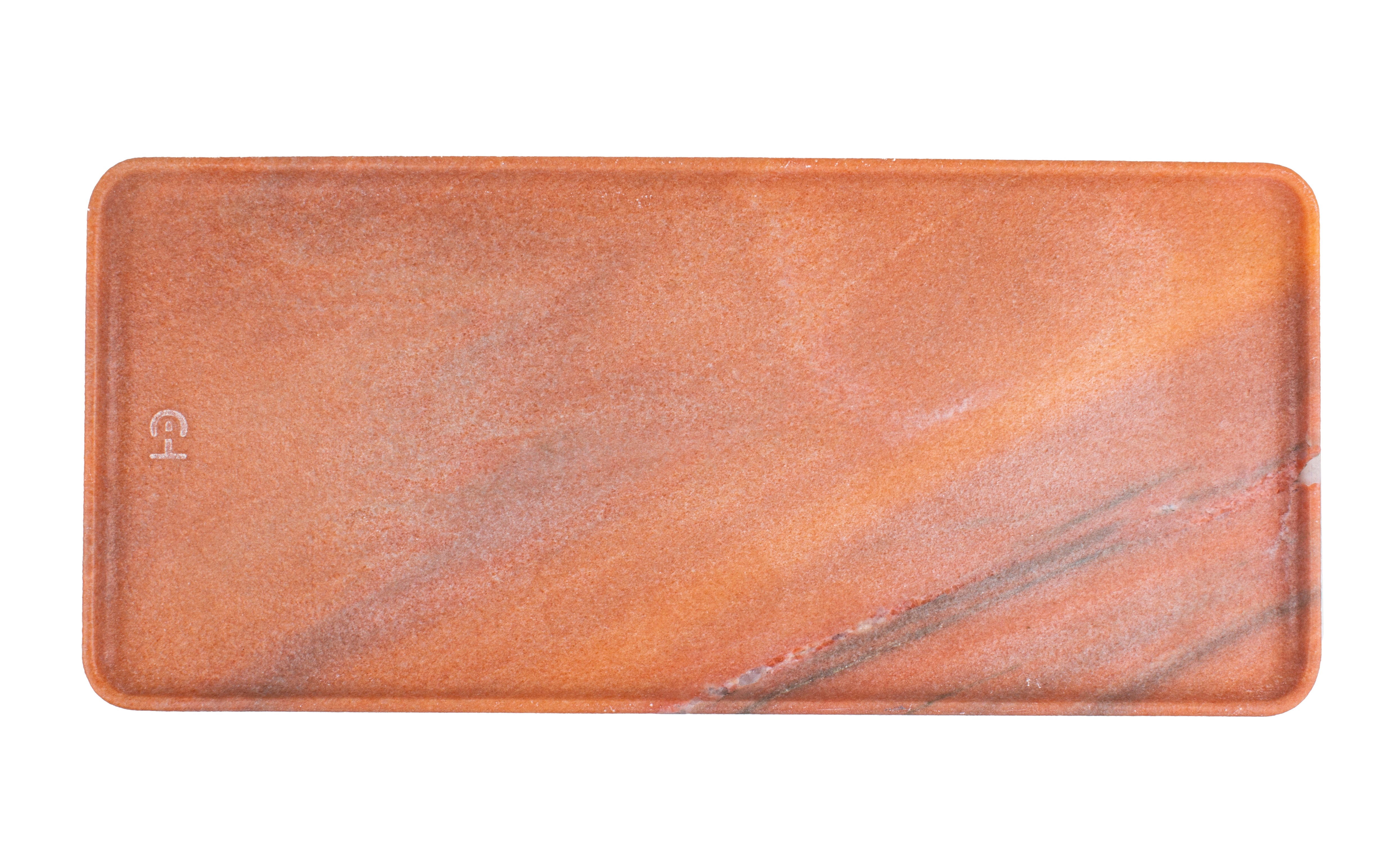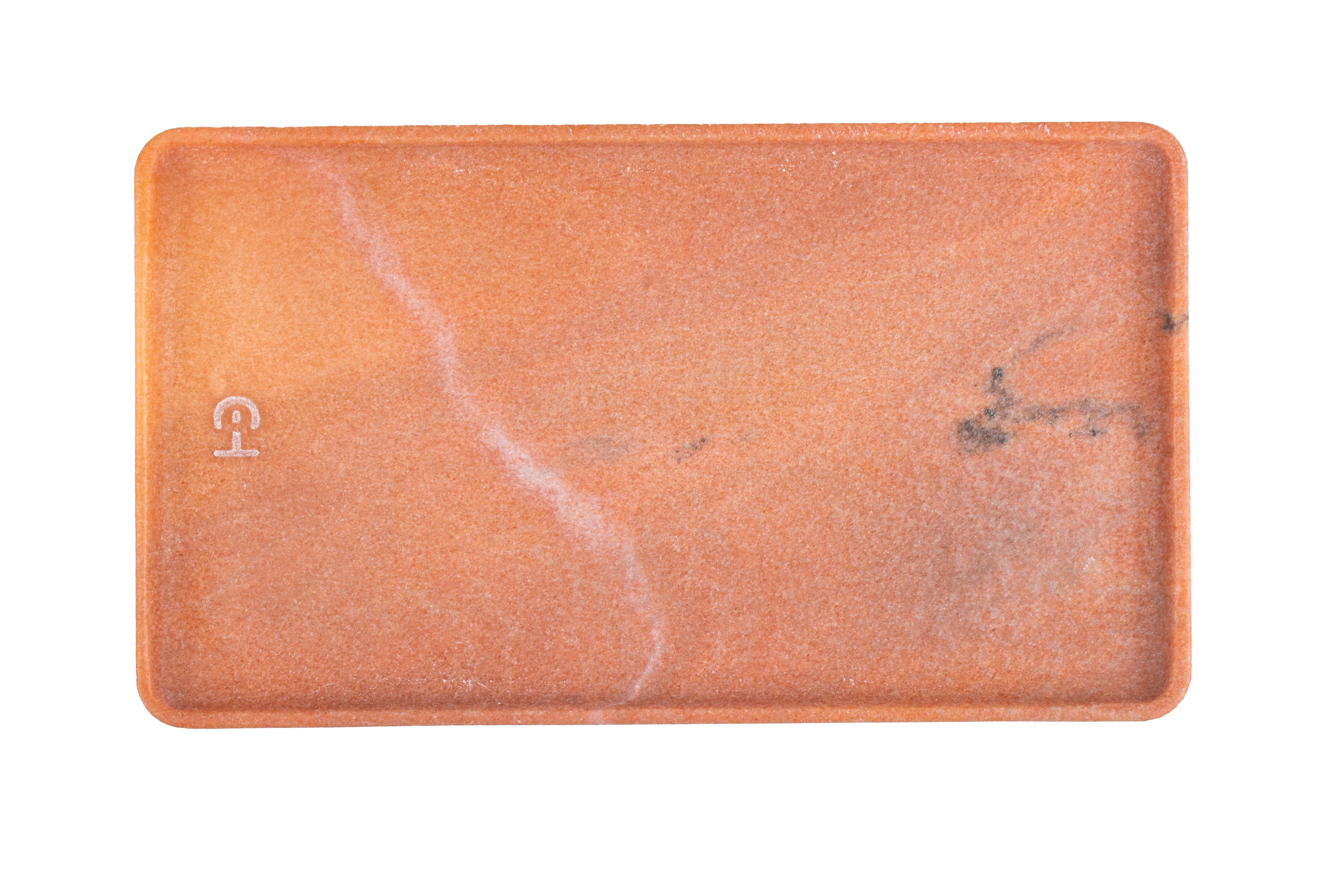 Functional, yet it has such simplicity that it suits so many uses. It lends itself effortlessly to so many uses being a minimalist silhouette type. Whether styled as this serving tray or catchall for essentials or even as a base for curated décor arrangements, it will bring subtle luxury to consoles, vanities, or tabletop displays. The soft pink hues provide warmth and the natural veining brings an artisanal, one-of-a-kind character to each piece.